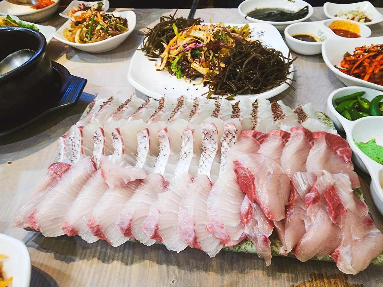 이 집 음식의 핵심인 자연산 회는 이곳을 찾는 단골 손님들이 가장 선호하는 가성비 넘치는 시그니처 메뉴다. 들리는 얘기로는 낚시 매니아인 이집 사장님이 직접 잡아온 고기들로 회를 떠서 손님들에게 내놓고 있다는 썰도 있는데, 바닷가 횟집도 아닌 전주 도심에서 낚시질로 횟집 물량을 댄다는 건 좀 무리지 싶다. 어쩌다 한번이라면 몰라도 매일매일 영업하는 횟집인 데다가 테이블 수도 제법 되고, 손으로 직접 써 벽에 붙여놓은 예약 리스트를 보면 단골 손님들도 적지 않음을 고려하면 더더욱 그런 판단이 든다.
