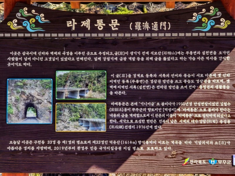 설천면 쪽에 세워져있는 안내판에 따르면 이 라제통문은 일제 강점기 금광 개발을 위해 뚫었다고 설명돼 있으나, 그보다는 일본인들이 전북 무주와 경북 김천, 거창을 잇는 우마차가 다닐 수 있는 신작로를 새로 만듦으로써 인근 금광에서 채굴한 금이나 수탈한 농산물을 보다 수월하게 실어나르기 위한 용도로 사용했다는 설이 더 설득력을 얻고 있다.