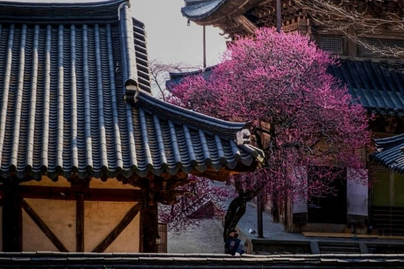 화엄매가 나같은 사진장이들로부터 특히 더 인기를 끄는 이유는 검은빛에 가깝다 하여 '흑매화'라는 별명까지 붙어있을 만큼 짙은 홍색을 띠고 있어 300년 넘는 세월의 무게만큼이나 묵직한 아름다움을 간직하고 있어서다. 그 서있는 위치도 각각 보물과 국보로 지정돼 있는 대웅전과 각황전 고색창연한 전각들 사이여서 고풍스런 아름다움까지 더해지면서 더더욱 매혹적이라는 건 안 비밀이다.
