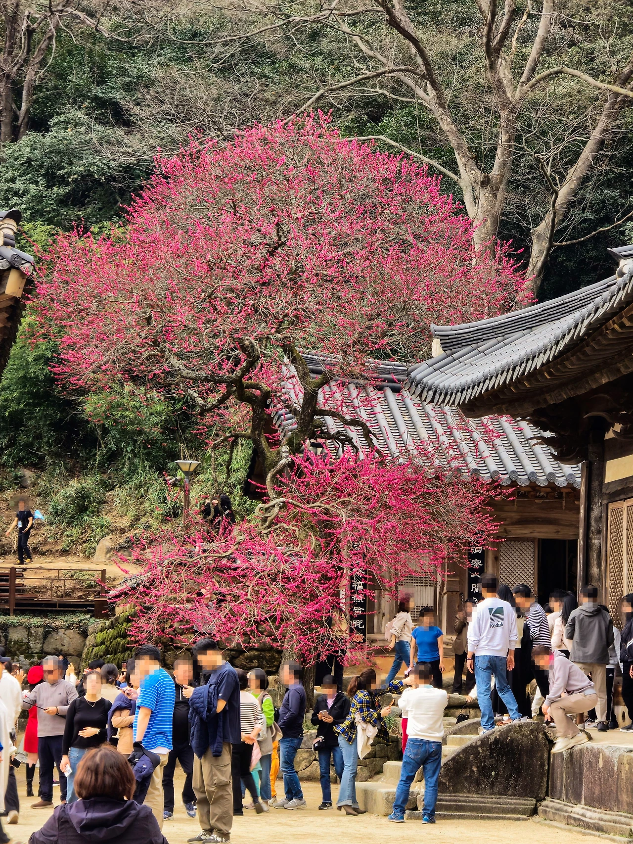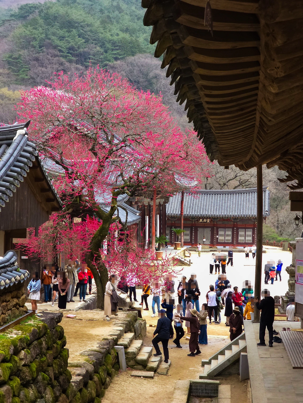 절 입구를 지나는 순간부터 이미 어느 정도 예상은 했었지만, 천왕문을 거쳐 대웅전 앞마당에 들어서는 순간 아내와 나는 기가 막혀 헛웃음이 다 나왔다. 화엄사에선 일찌기 본 적 없는 어마무지한 사람들 행렬 때문이었다. 각황전과 대웅전 사이에 위치한 화엄매 주변으로 구름 인파가 몰려 화엄매를 배경 삼아 인증샷을 찍으려 아귀다툼 아닌 아귀다툼을 벌이고 있었다.