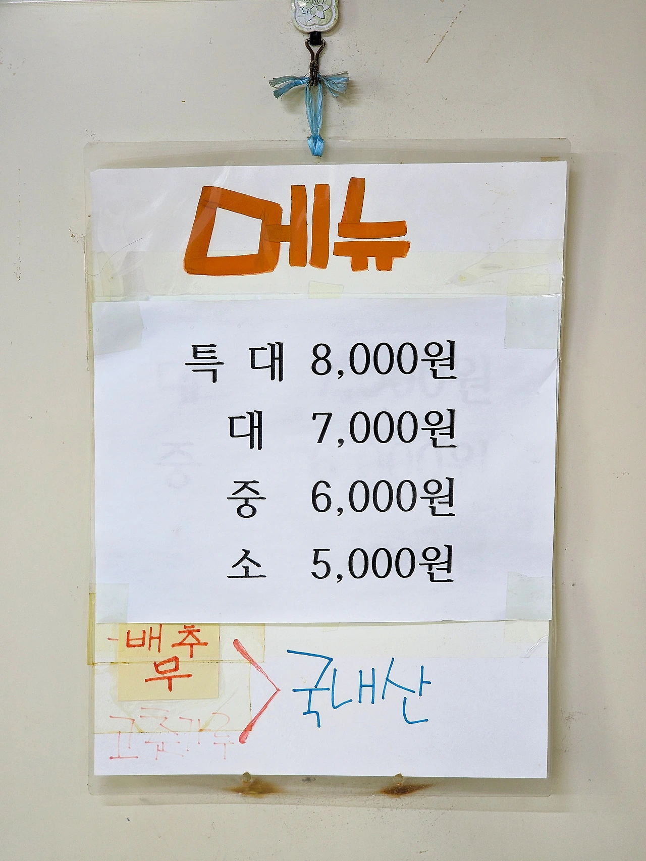 어쩌면 과거 한때 전국적으로 큰 유행을 이끌었던 세숫대야 냉면 원조쯤 되는 곳이 바로 여기 아닐까 싶을 정도다. 오로지 물국수 한 가지 메뉴만 취급하고, 손님들 뱃골 크기에 따라 특대와 대-중-소 4가지 그릇 크기로만 나눠 국수를 판매하는데, 먹방 고수쯤이나 되면 모를까 어지간한 장정들도 특대 사이즈는 손을 들 정도로 양이 어마무지하다.