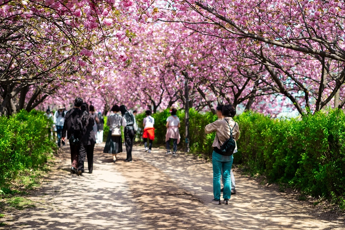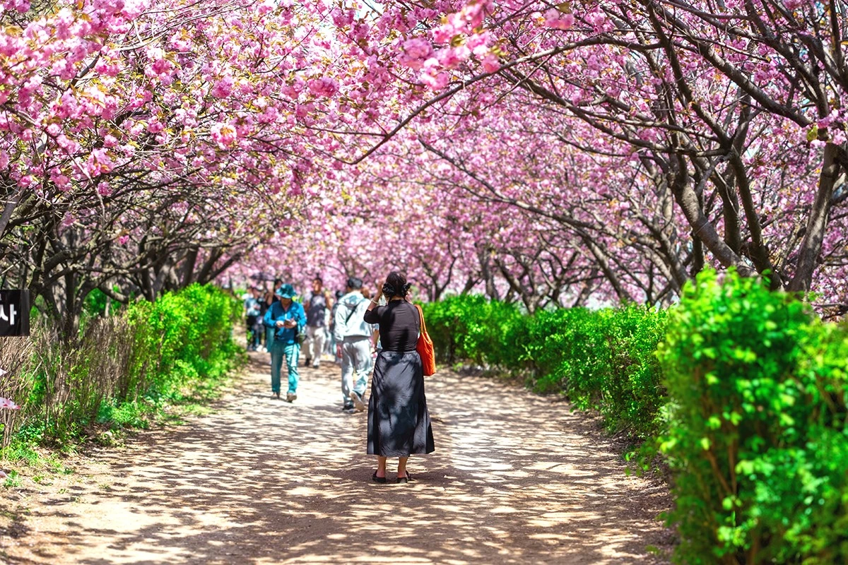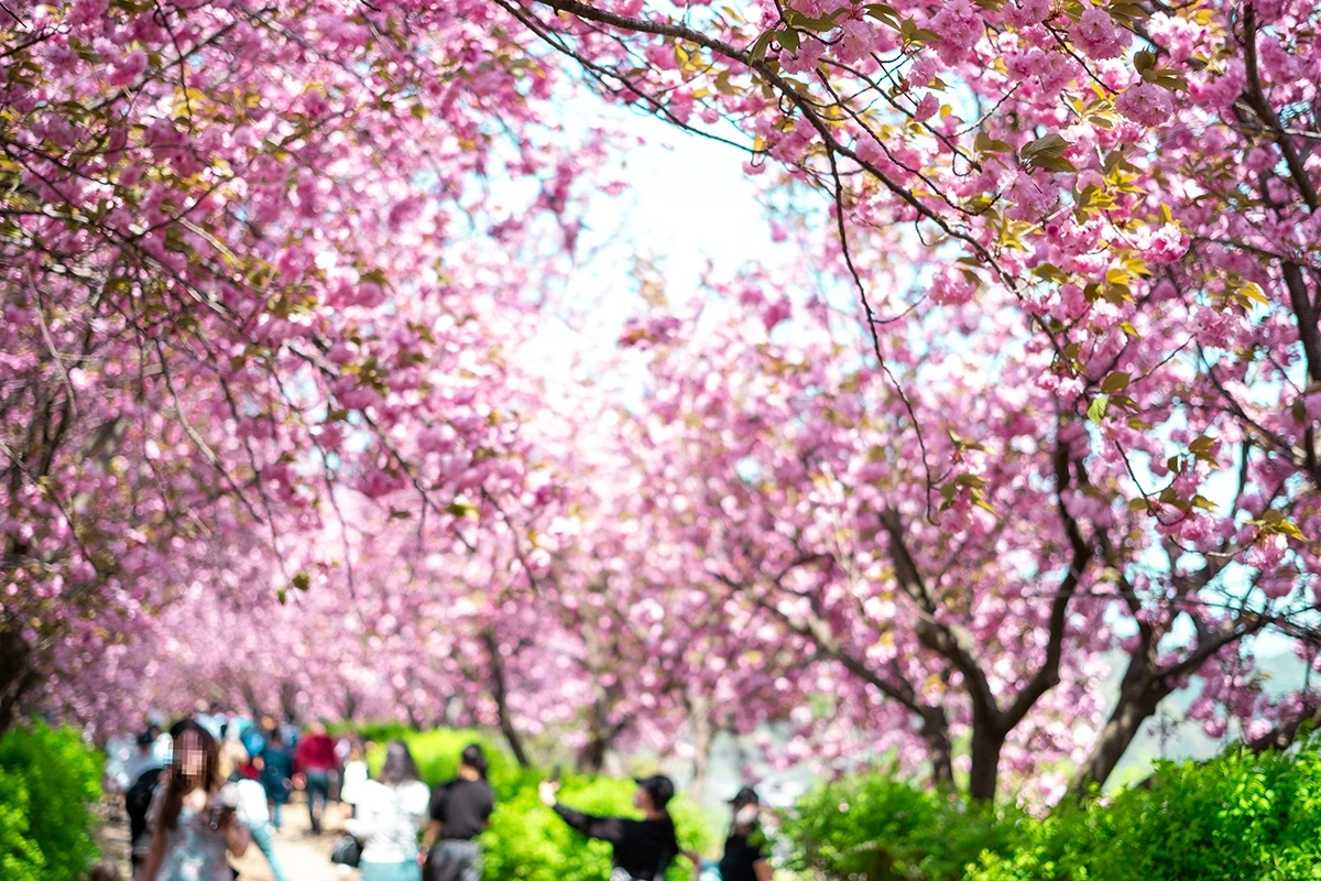 그쪽 방향으로 얼마간 더 나아가니 하늘을 덮은 채 긴 터널을 형성한 겹벚꽃 행렬이 나를 반겨줬다. 그동안 한두 그루 정도 있는 겹벚꽃을 본 적은 여러 차례 있지만, 터널을 이룰 정도로 울창한 겹벚꽃 행렬이란 이렇게 황홀한 느낌이구나 하는 감탄사가 절로 튀어나왔다.