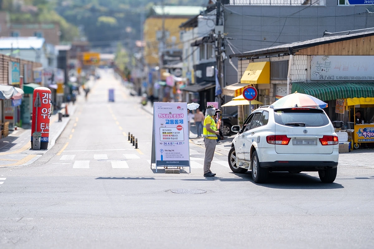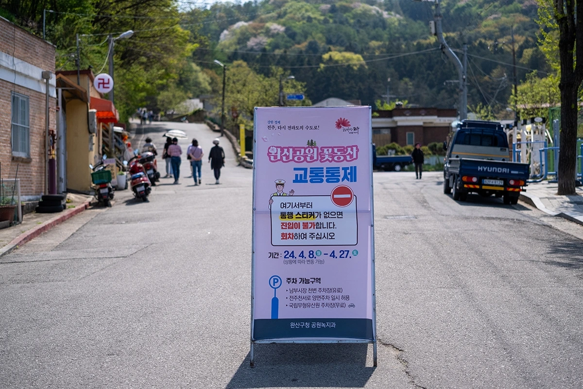 완산칠봉 꽃동산을 목적지로 하는 여행자들 입장에선 그 이상 좋은 선택지는 없을 거란 생각이 들 정도로 접근성이 좋아서다. 그곳에 차를 세운 뒤 몇 걸음 걷지도 않아 완산칠봉 방향 차량 진입을 통제하는 통제선을 마주쳤을 정도다. 차로 갈 수 있는 가장 가까운 곳까지 접근했다는 얘기 되시겠다.