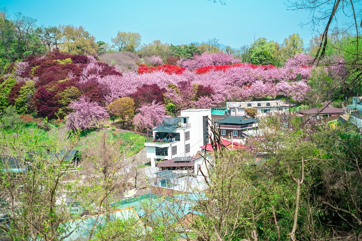 결국 다시 길을 돌아 초록바위 방향으로 몇 백미터를 나아가자 한 순간 눈앞에 '꽃동산'이란 이름이 딱 어울리는 동네가 짠 하고 나타났다. 저 멀리 보이는 산 위로 겹벚꽃이며 철쭉 등 온갖 꽃들이 온 산을 뒤덮고 있었다.