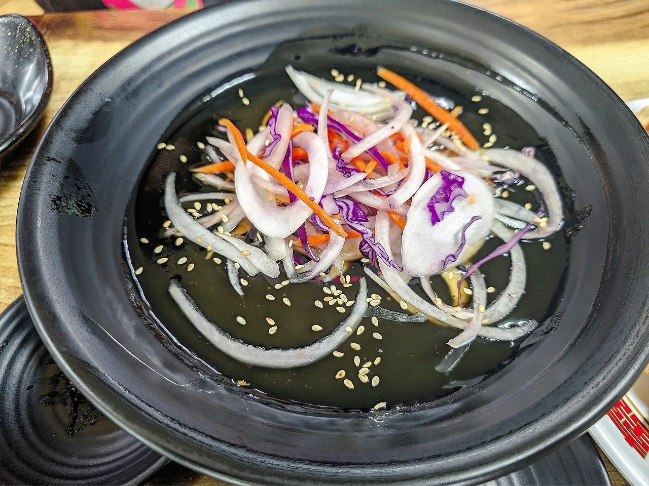 비유컨대 함흥냉면 중에서도 비빔냉면 류의 강렬한 자극을 기대하고 갔는데 평양냉면 류의 슴슴한 맛을 마주한 느낌이었다고나 할까? 짜장면 양념과 매운 짬뽕 양념을 섞어놓은 듯한 강렬한 비주얼과는 달리 왕중왕짜장 시그니처메뉴 비빔짜장은 한 입 베어무는 순간 자극적인 느낌은 거의 없고 입과 속이 편안해지는 맛을 선사했다.