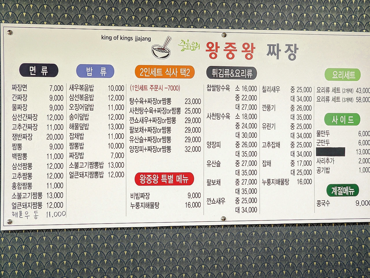전주역 오가는 길에 '왕중왕짜장'이란 간판을 처음 봤을 때 나는 솔직히 '이건 뭐야, 유치하게시릿!' 하는 생각을 했었다. 주인장 성이 손씨라는 이유로 '손짜장'이라 간판을 해 달았다는 어느 라디오 사연 속 중국요리집만큼이나 무성의하단 느낌조차 들었다. 설마 주인장 성씨가 왕은 아니겠지 싶기도 했다. 만일 정말 왕씨라면 본의 아니게 성희롱(?)을 한 셈이니 죄송하다.