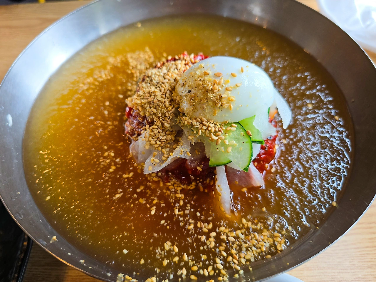 이 집 냉면은 탄탄하고 쫄깃한 식감이 일품인 칡냉면 면발을 사용하고 있는데, '물냉파'인 아내 걸 몇 숟가락 슬쩍 뺏어먹어본 결과 16시간 동안 온갖 정성을 들여 만들어낸다는 냉육수 덕분인 듯 시원함은 기본이요 감칠맛까지 깊이 우러나 온몸이 냉면 속으로 풍덩 다이빙해 들어가는 쾌감이 느껴질 만큼 '존맛'이었다.