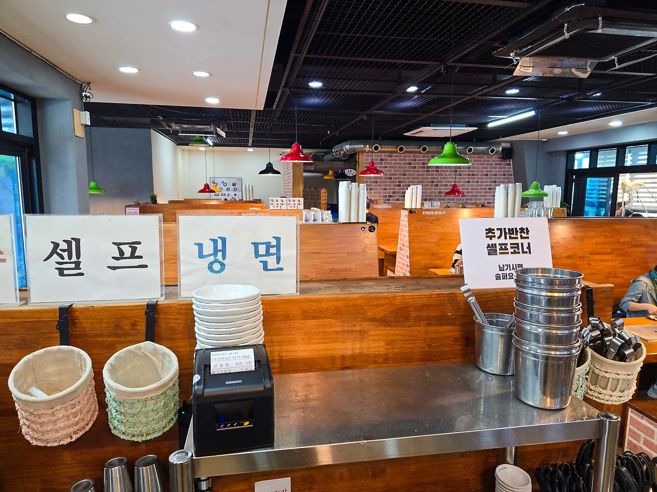 한 가지 아쉬웠던 건 다소 불친절한(?) 영업 스타일이었다. 사장님이나 직원들 응대 태도야 더없이 친절했지만, 기본으로 제공되는 열무김치 말고도 셀프바에서 맛난 깍두기와 육수를 가져다 먹을 수 있다는 사실을 정확히 알려주지 않았기 때문이다. 특히 불냉면을 시켜먹은 내 경우 '육수가 있음 더 좋았을 텐데...' 하는 아쉬움을 느꼈더랬는데, 알고 보니 셀프바에 가면 양껏 가져다 먹을 수 있었던 걸 미처 알지 못했던 거였다. 나같은 초보 방문자들을 위해 각 테이블마다 안내문을 비치해주면 좋지 않을까 싶다.
