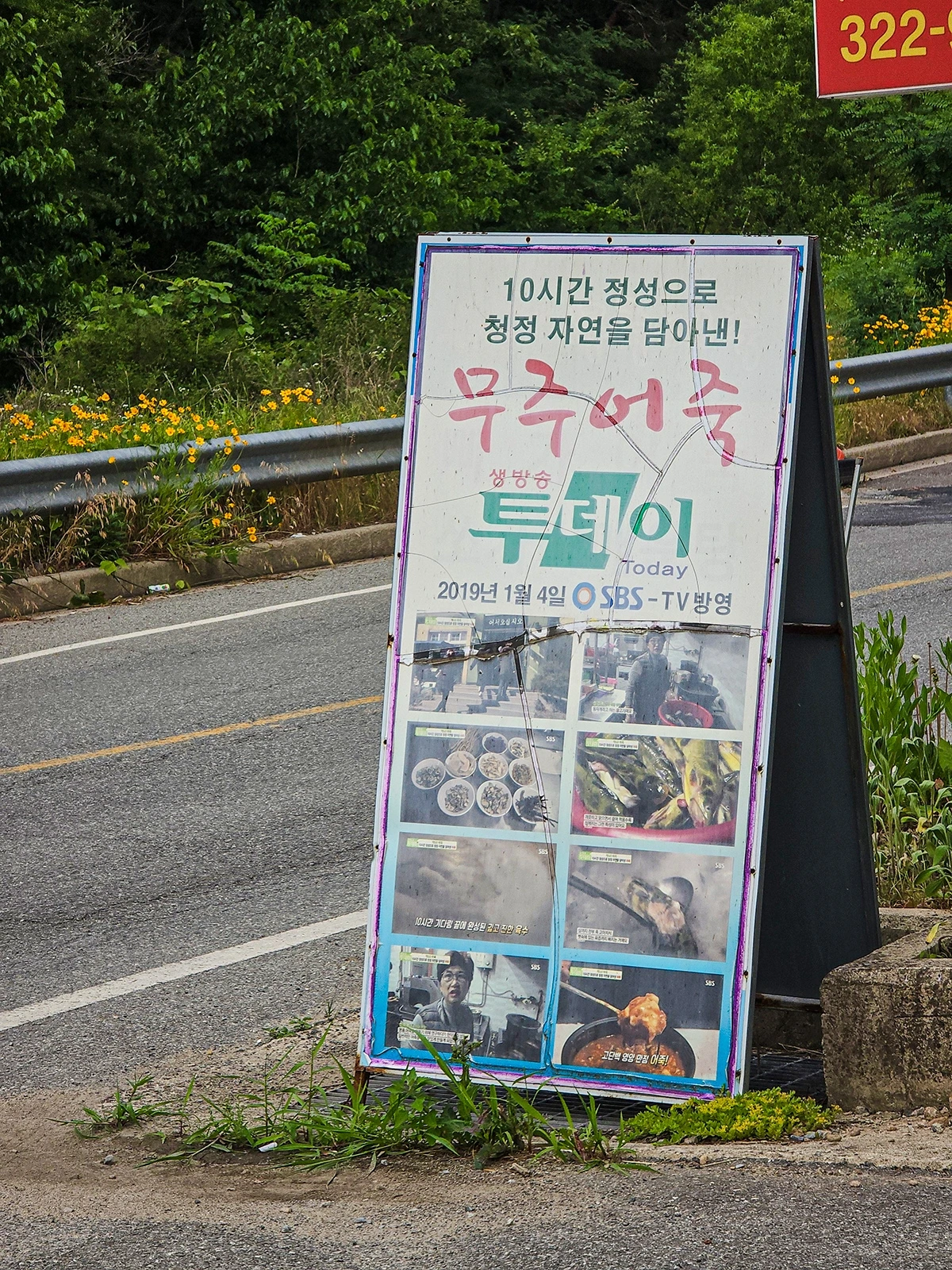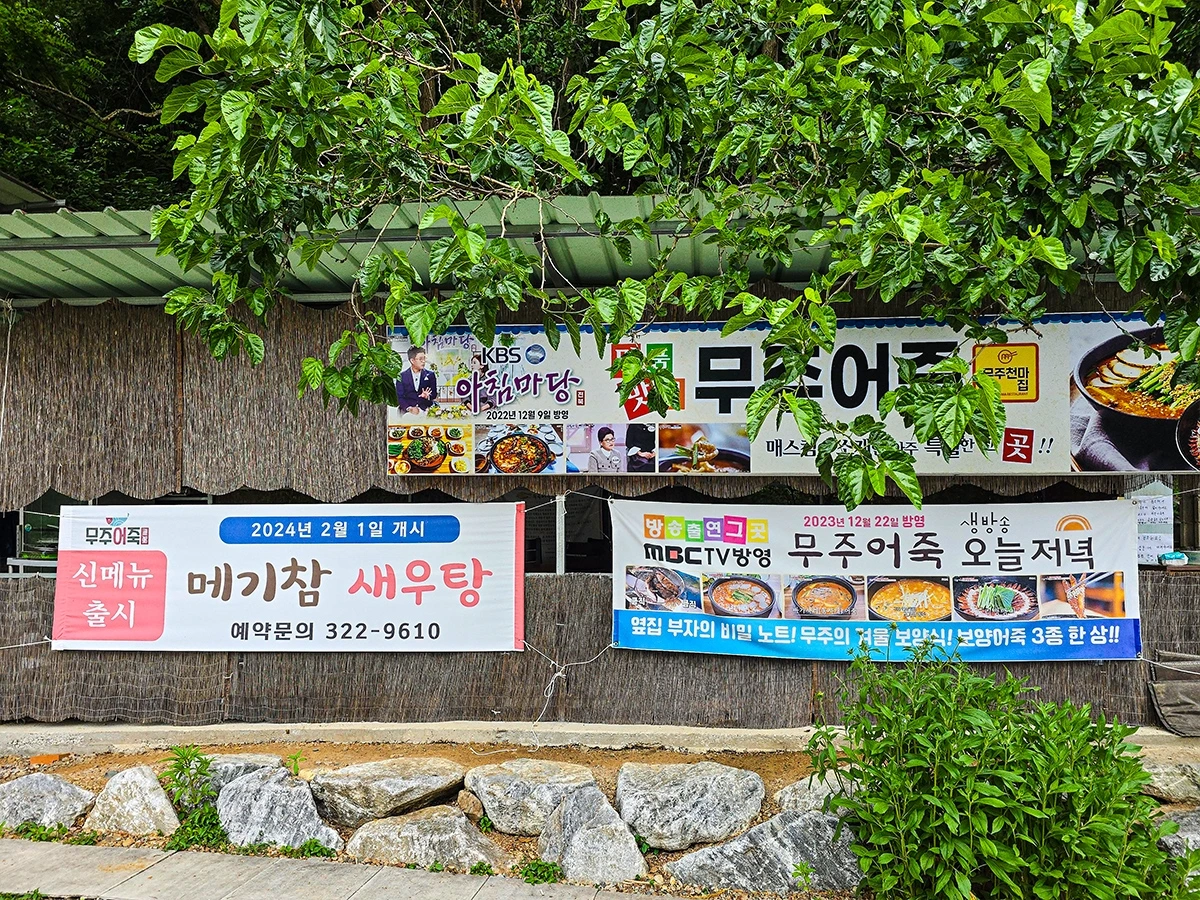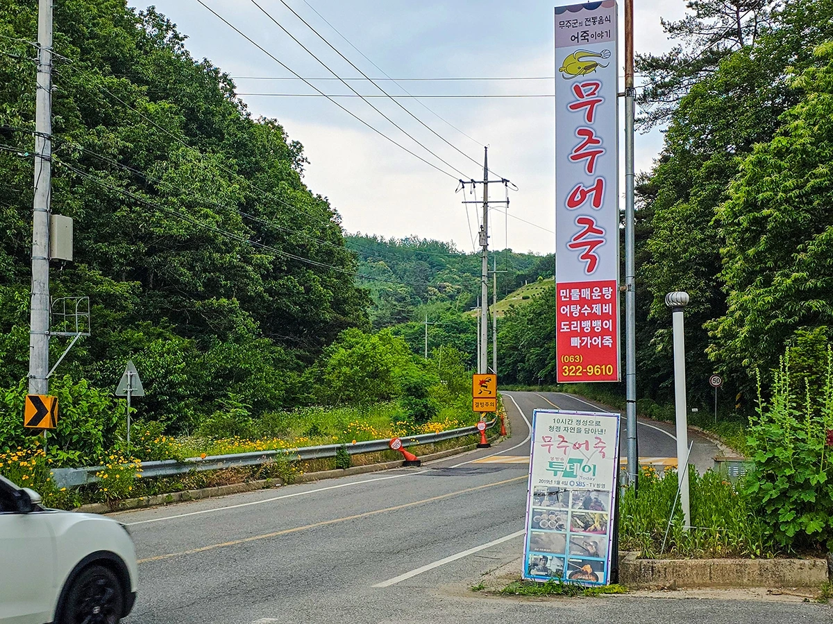 무주읍에서 내도리 방향으로 몇백 미터쯤 가다 보면 나오는 <무주어죽> 앞을 꽤 여러 차례 지나쳤지만, 그래서 나는 몇 번이나 그냥 지나치곤 했더랬다. 지나가는 차들도 잘 볼 수 있도록 도로변에 'SBS 생방송투데이', 'MBC 생방송 오늘저녁', 'KBS 아침마당 등 방송출연 이력을 줄줄이 써붙여 놓은 걸 보고는 무의식 중에 안 좋은 선입견을 가졌었던 듯하다.
