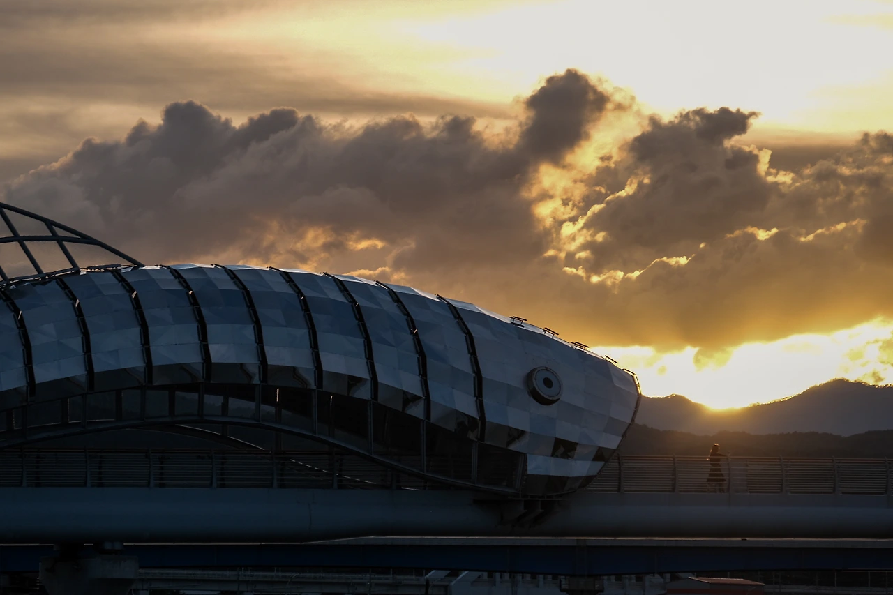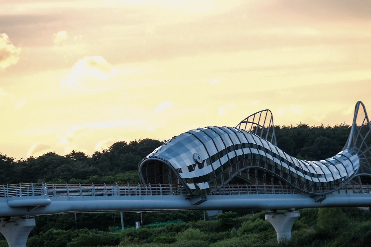 그 모습에 화룡정점을 찍은 건 어느 순간 짠 하고 켜진 경관조명이었다. 초록색과 빨간색 등 조명들이 명멸하면서 은어 모양을 한 거대한 조형물이 생명력 넘치게 새로 태어나면서 주변 풍경을 장악하기 시작했다.