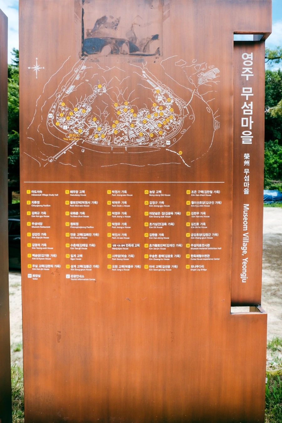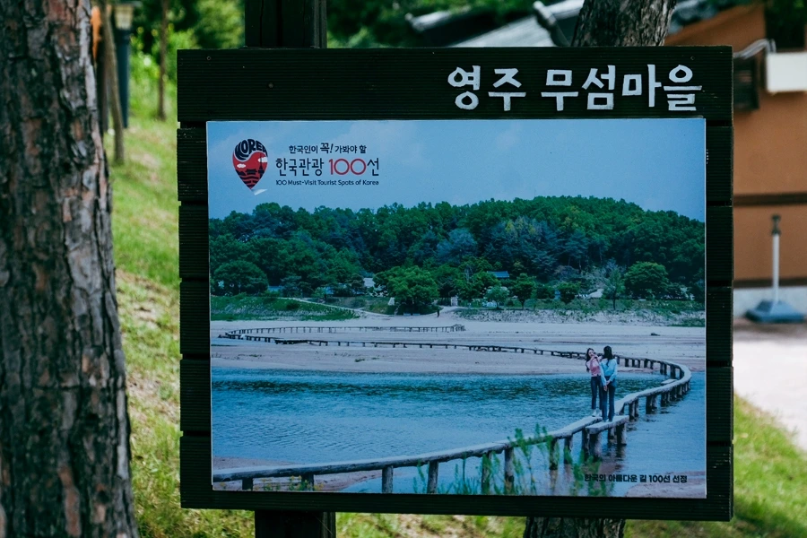 여기서 잠깐 무섬마을이란 이름이 낯선 분들을 위해 설명을 드리자면, 이곳은 물 위에 떠있는 섬마을이라 하여 '무섬(물섬)마을'이란 이름이 붙은 곳이다. 달리 육지 속 섬마을이라 불리기도 하는데, 옛날엔 하천을 가로지르고 있는 외나무다리가 뭍을 오가는 유일한 통로라 시집오는 새색시들도 꽃가마를 탄 채 이곳을 건넜다고 한다.