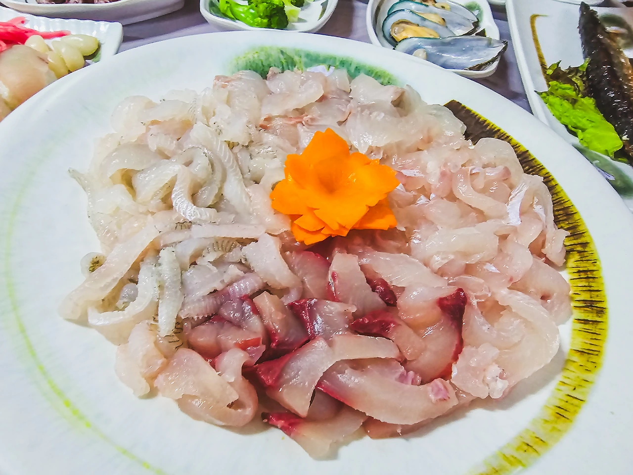 이날 우리 가족이 선택한 메뉴는 11만원짜리 자연산모듬회 대짜. 평소 동네 횟집에서 네 식구가 먹던 가격 견적에 비하면 좀 많이 헐한 편이라 양이 부족하진 않을까 우려했는데, 서비스로 나온 이런저런 기본 음식들과 곁들여 먹어본 결과 아주 맛나고 알차고 만족스럽게 먹을 수가 있었다.