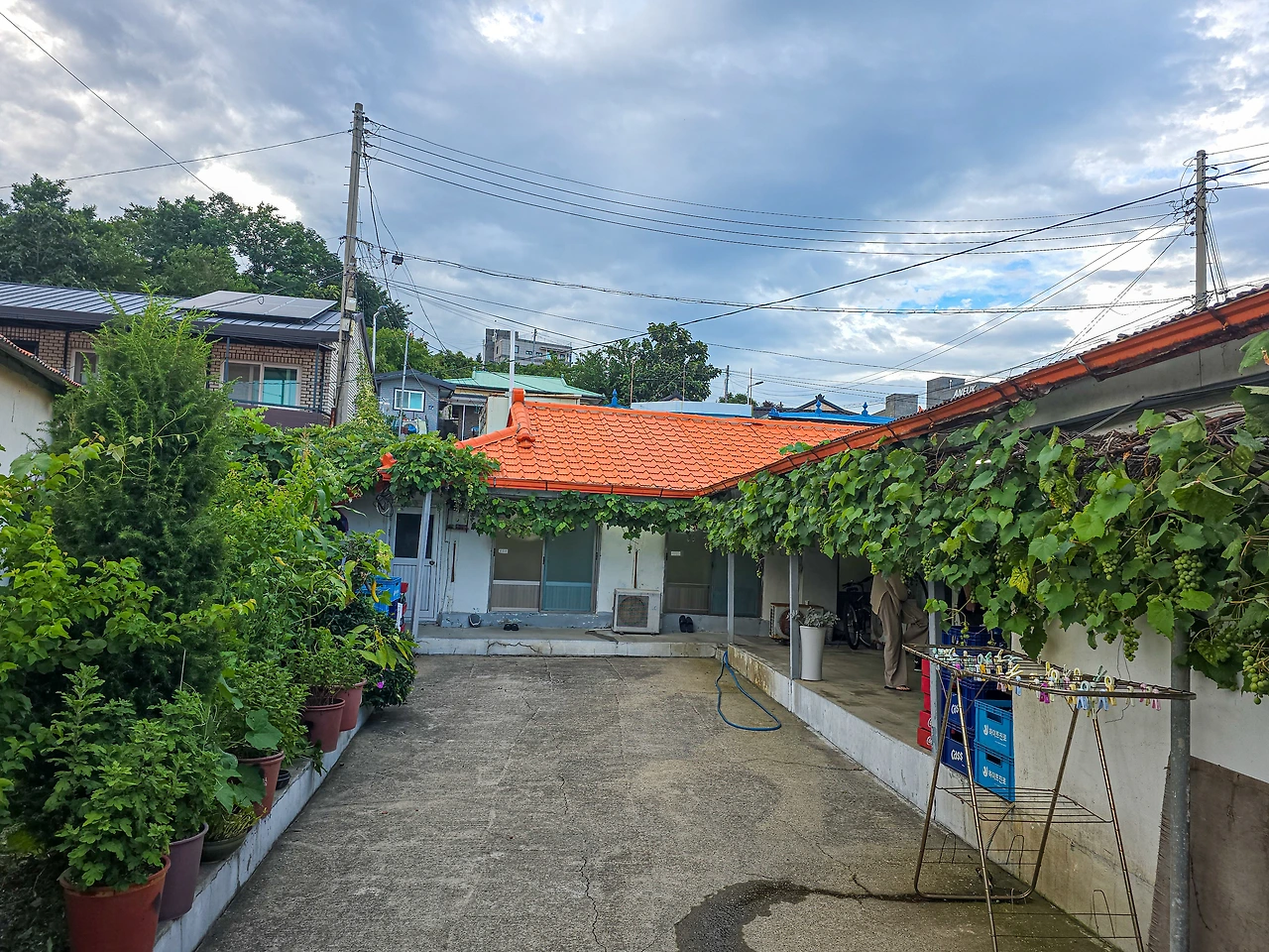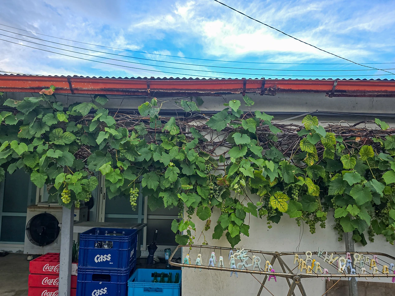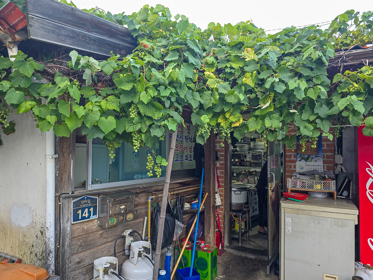그래서 찾아가봤는데, 음식점 입구에 들어서는 순간 우리 가족은 일제히 환호성을 내지르고야 말았다. 출입문을 중심으로 디귿자 구조로 이뤄진 마당 있는 시골집 스타일의 그 음식점 처마를 따라 몇 송이인지 헤아리기조차 힘들 만큼 수많은 포도송이들이 주렁주렁 매달려 있었기 때문이다. 이건 뭐 포도밭에다가 횟집을 차린 건 아닌가 하는 느낌적인 느낌마저 들 정도였다.