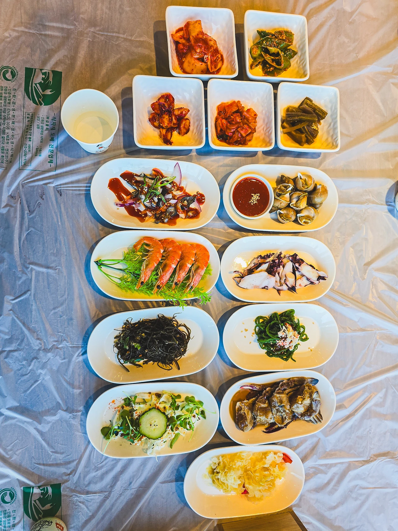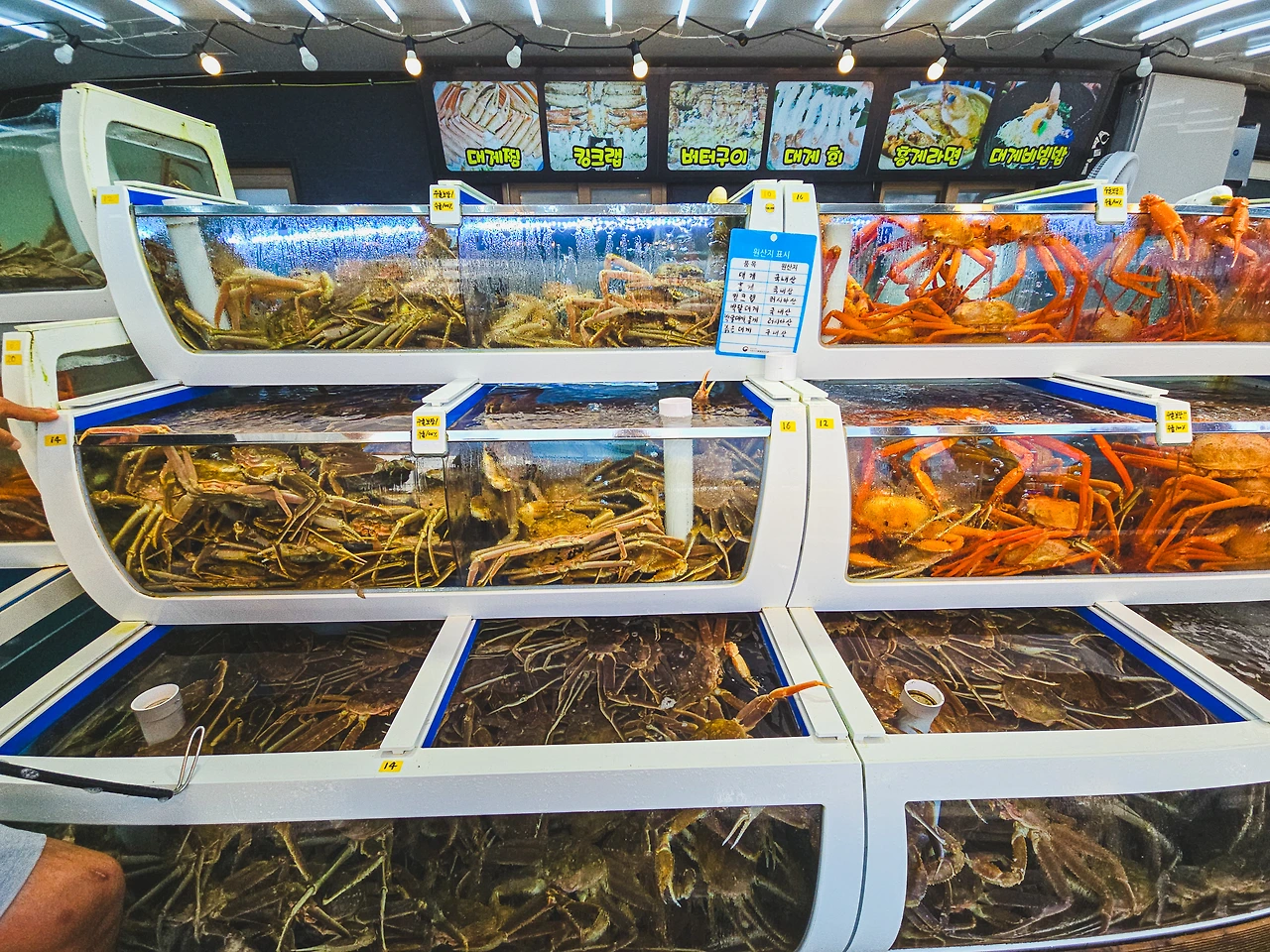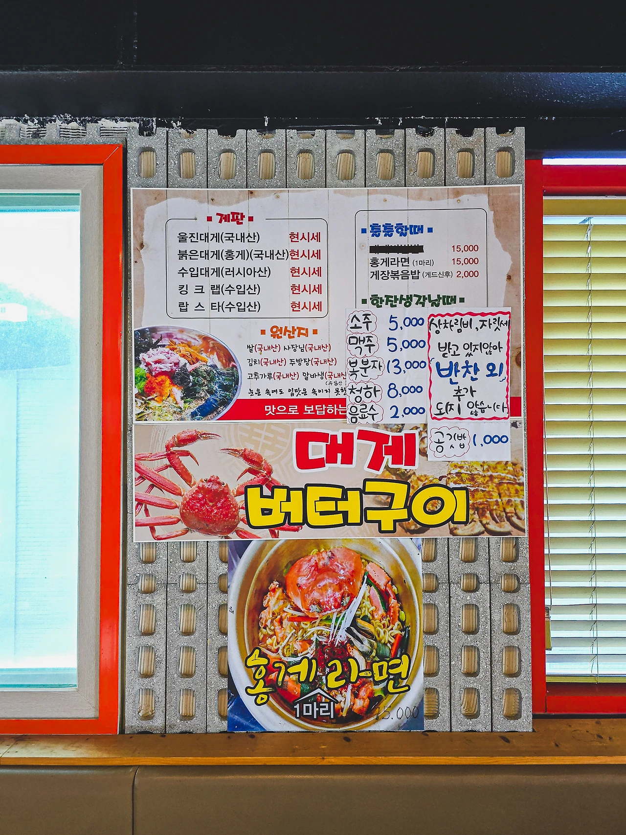 도착해 보니 원조대게후포리는 소문난 맛집답게 어항 규모부터가 남달랐다. 울진대게와 붉은 홍게, 킹크랩 등이 종류별로 어항들을 가득 채우고 있었는데, 그 중간중간에는 '수율보장 수율 100%'라는 안내문구들이 곳곳에 붙여져 울진대게 품질에 대한 이 집 사장님의 은근한 자부심을 뽐내고 있었다.
