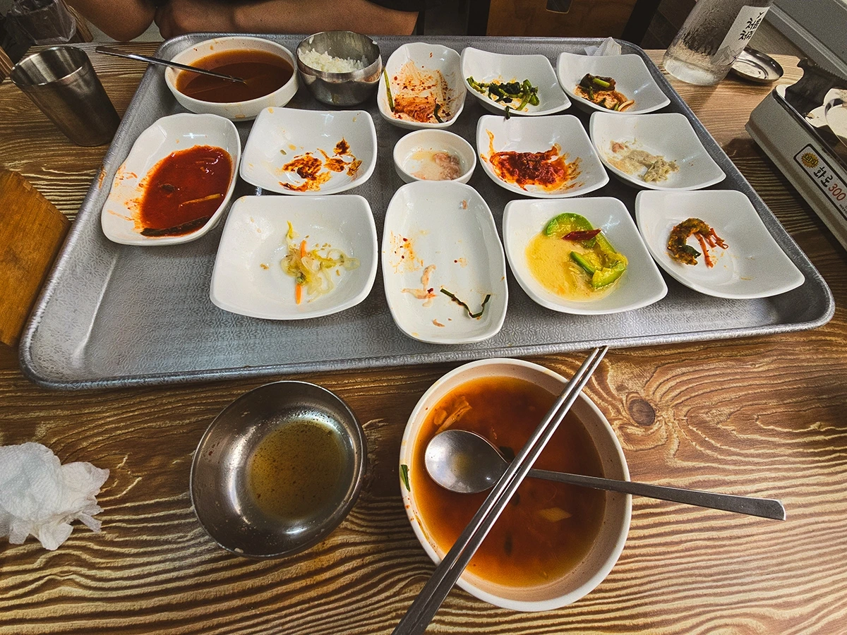 테이블은 좁은데 밑반찬이 빽빽히 채워진 쟁반째 올려놓다 보니 밥그릇 놓을 자리가 옹색해지는 건 물론, 메인요리인 홍어찌개는 테이블 가운데가 아닌 한 옆으로 완전히 빼야 하다 보니 한 그릇 떠먹을 때마다 자리에서 벌떡 일어나 국자질을 해야 하는 불편함이 있었기 때문.