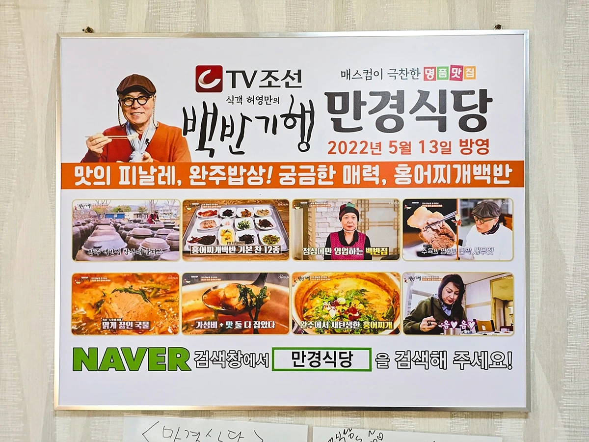 전북 완주군 하고도 고산면이라는 시골 동네에 있는 만경식당을 내가 처음 알게 된 건 같은 완주군 내 숯불돼지갈비 맛집 '자연을 닮은 사람들' 덕분이었다.해당 음식점에 인기 TV프로그램 '백반기행'으로 유명한 허영만이 다녀갔다는 얘길 듣고 '완주군 허영만 백반기행'이란 키워드로 관련 자료를 찾던 중이었는데, 우연인지 필연인지 같은 완주군 지역에 또 하나의 방송출연 맛집이 짜잔 하고 나타났던 거다. 홍어찌개 전문점 만경식당이 바로 그 주인공이었다.