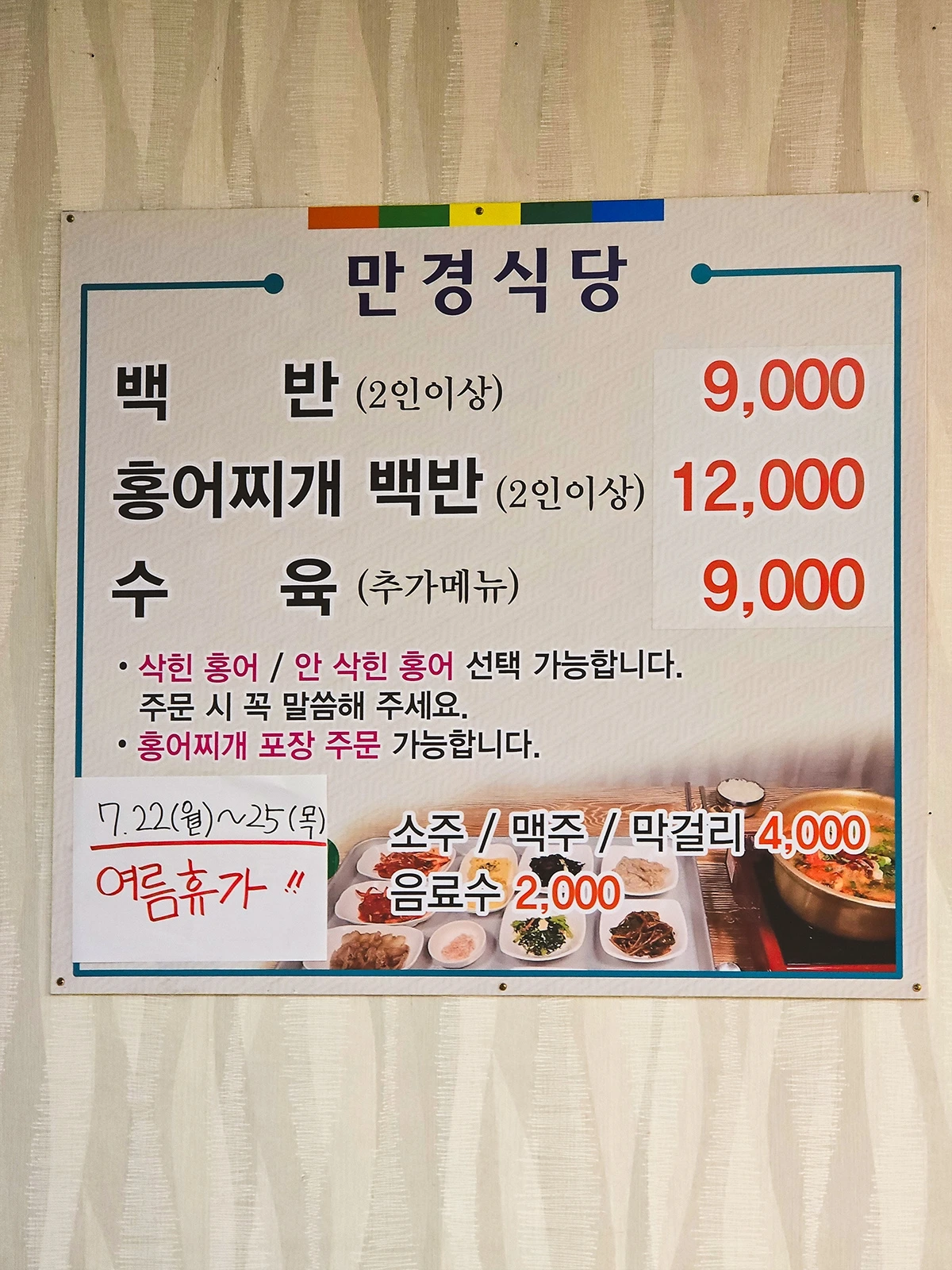 10년 가까이 한 자리에서 홍어찌개 전문점을 해왔으면 독한 암모니아 냄새가 가게 안 구석구석까지 잔뜩 배어 있을 걸로 예상됐던 것과는 달리 만경식당은 뭘 어떻게 했는진 몰라도 같은 업종 음식점 대비 매우 쾌적한 상태였고, 삭힌 홍어를 주문했음에도 불구하고 그 맛이 나 같은 초보 입문자조차 많이 힘들이지 않고도 맛있게 먹을 수 있을 만큼 좋았다.