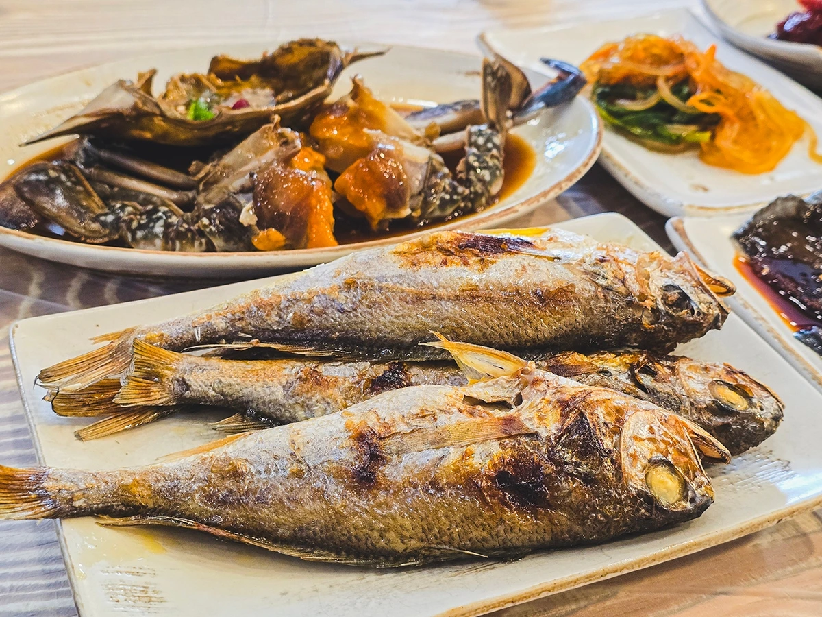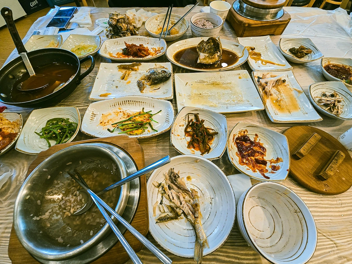 2인 상차림 기준으로 노릇노릇 잘 구워진 보리굴비와 굴비구이 4마리, 조기매운탕, 간장게장을 주연 삼아 가마솥밥과 맛깔난 밑반찬들이 한 상 가득 차려져 나왔는데, 남도 특유의 좀 세다면 센 간이 음식들 전반에 골고루 배어있어 씹을수록 깊은 맛이 우러나는 느낌이었다.
