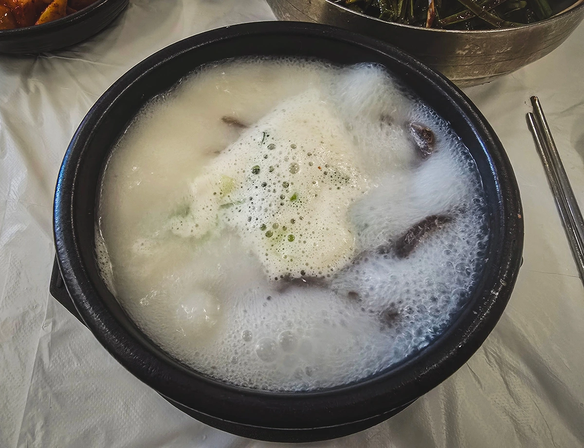 사실 처음 음식이 나왔을 땐 '이 집 이거 곰탕 맛집 맞낫?' 하는 의문이 살짝 들기도 했더랬다.언젠가 곰탕과 설렁탕의 차이에 대해 들었던 어설픈 기억이 있어서다. 그 기억에 따르면 곰탕은 비싼 소고기 중에서도 고급진 부위만을 사용해 푹 고아냄으로써 맑은 국물이 나오는 게 특징이라 했고, 설렁탕은 뼈와 잡고기를 주로 사용해 국물이 뽀얗다고 들었었는데, 부여 왕곰탕에서 차려내 온 건 국물이 뽀얀 빛을 띠고 있었기 때문.