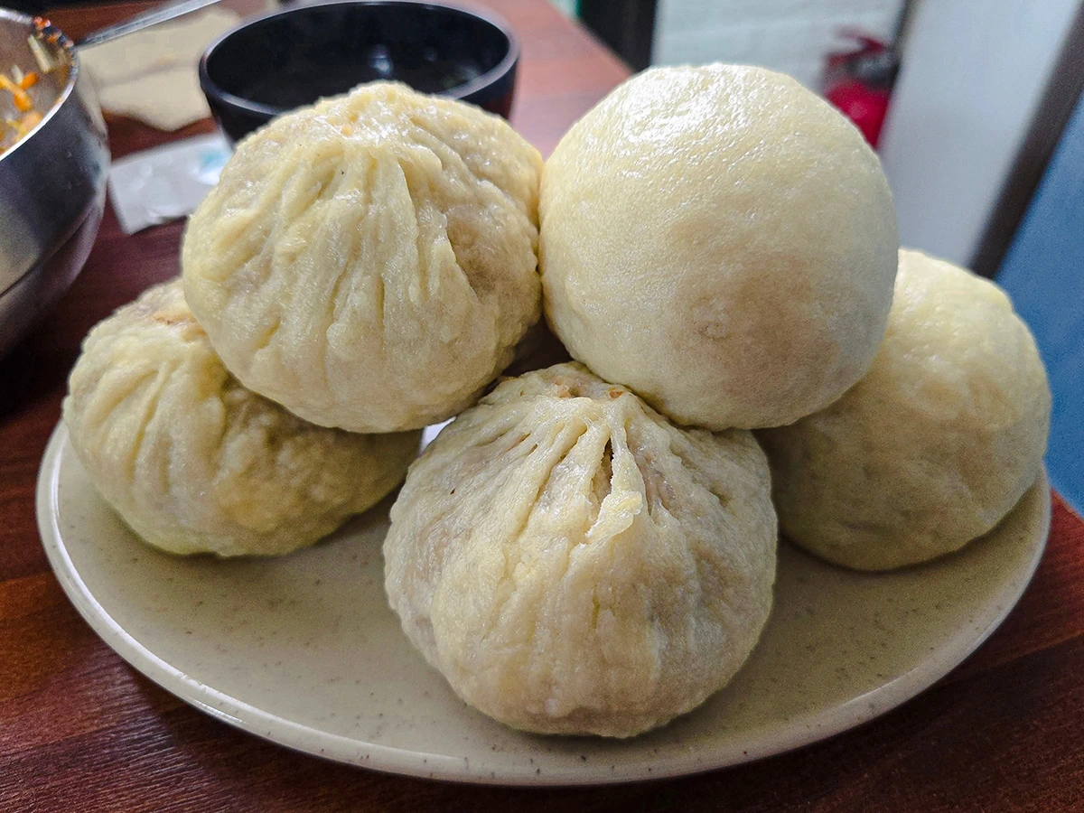덕분에 오픈을 하고 나서도 30여 분이 더 지난 뒤에야 겨우 이 집 시그니처메뉴인 수제만두와 찐빵, 쫄면 등을 영접할 수 있었다. 2016년 백종원의 3대천왕 방송 당시 수제만두 접시가 등장하자 출연자 중 누군가가 "야구공을 갖다 주넷!" 하고 감탄사를 내뱉었더랬는데, 야구공이란 그 표현이 무색하지 않을 만큼 일찌기 다른 곳에선 본 적 없는 압도적인 비주얼의 왕만두가 순간 내 눈길을 확 사로잡았다.
