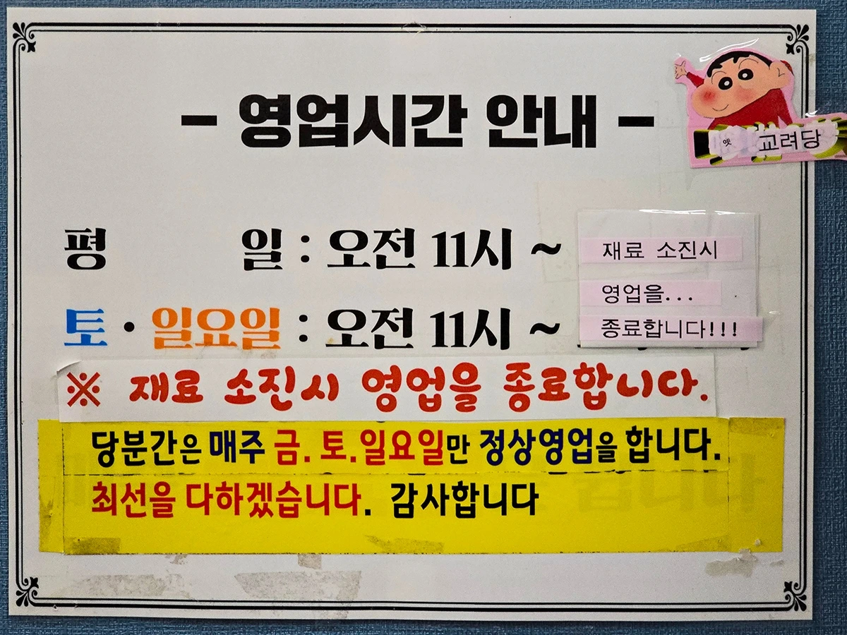 하지만 그런 방송에 소개된 맛집이라는 사실보다 내 마음을 더 훅 잡아 끌었던 건 어떤 사람이 SNS에 올린 이용 후기 사진 한 장이었다. '영업시간 안내'라는 제목 아래 실린 해당 사진에는 '당분간은 매주 금 토 일요일만 정상영업을 합니다. 최선을 다하겠습니다'라는 안내글이 쓰여있었기 때문.