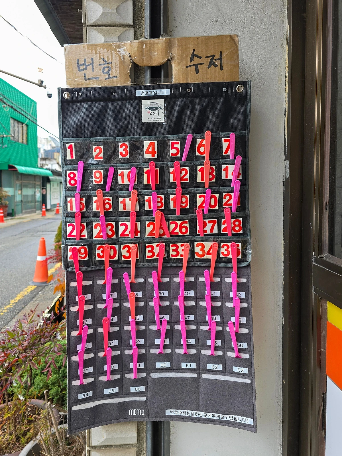 그럼에도 불구하고 역시나 줄서는 건 최대한 피하고 싶어 오픈런을 할 작정으로 나는 음식점 오픈 시간인 10시보다 20여 분이나 일찍 그곳을 찾았다. 그리고 도착 즉시 문앞에 쪼르륵 걸려있는 대기번호표부터 뽑았는데, 아뿔사 나름 서둔다고 서둘렀건만 대기번호표는 내 앞에 벌써 열 몇 팀이 이미 와있노라 말해주고 있었다. 음식점 문 앞이 텅 비어 있길래 안심했다가 뒷통수를 맞은 기분이었다. 오 마이 배드뉴스다.