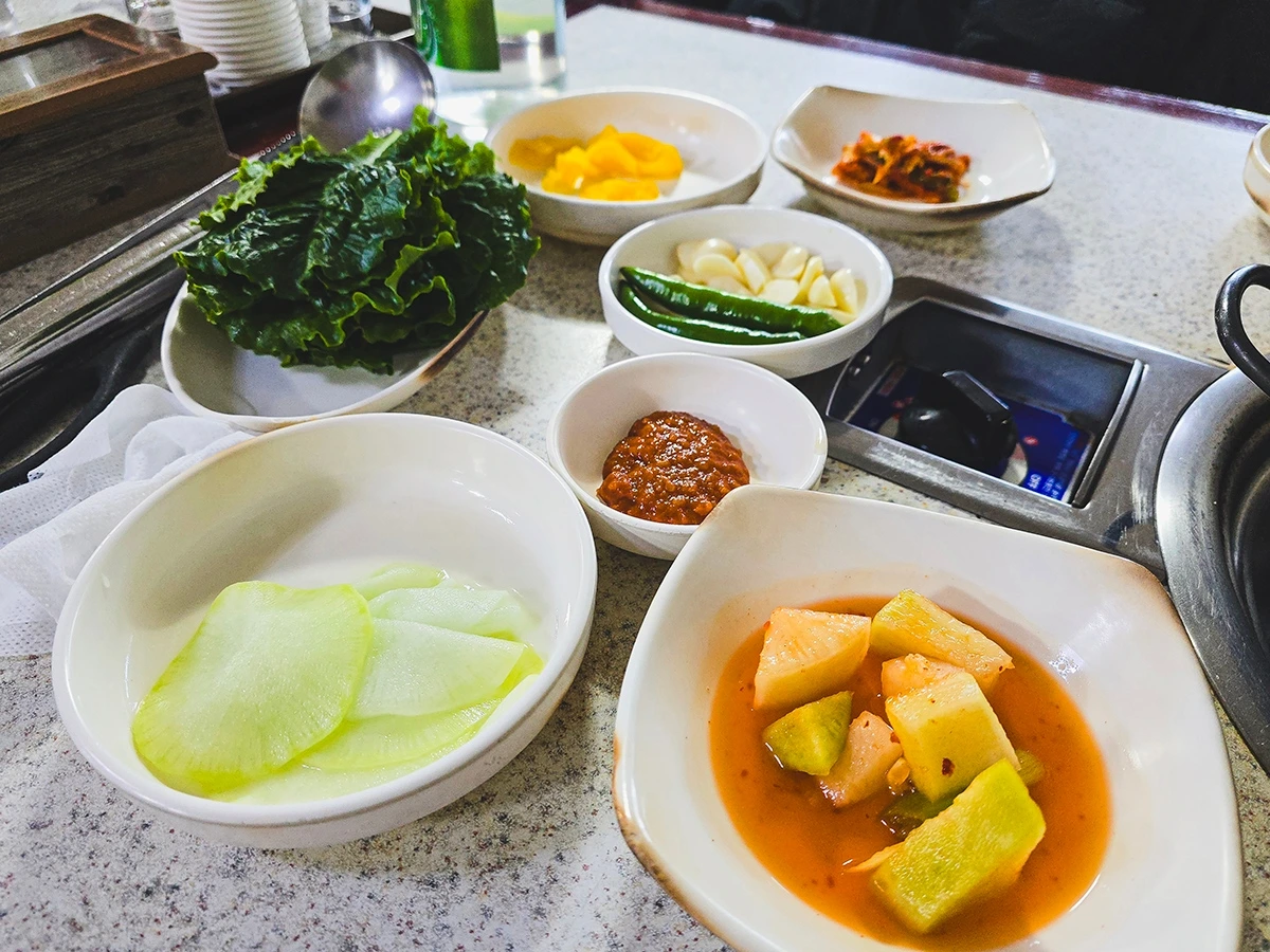 다른 하나는 밑반찬이 너무 부실하다는 거다. 주연인 물갈비를 더더더더더더더욱 돋보이게 만들어주기 위해 일부러 그럴듯한 조연 하나 없이 행인1, 행인2 정도 존재감조차 없는 밑반찬들을 배치한 게 아닌가 하는 의심이 다 들 정도로 밑반찬이 정말 별로였다. 다른 동네라면 몰라도 전주라는 도시는 '백반집 밑반찬만 갖고도 막걸리 몇 병쯤은 먹을 수 있는 곳'이라는 이미지가 강한 곳인데, 그 전주란 도시 내에서도 손꼽히는 맛집 밑반찬 수준이 그 정도라는 건 좀, 아니 아주 많이 매우 아쉬운 부분이다.