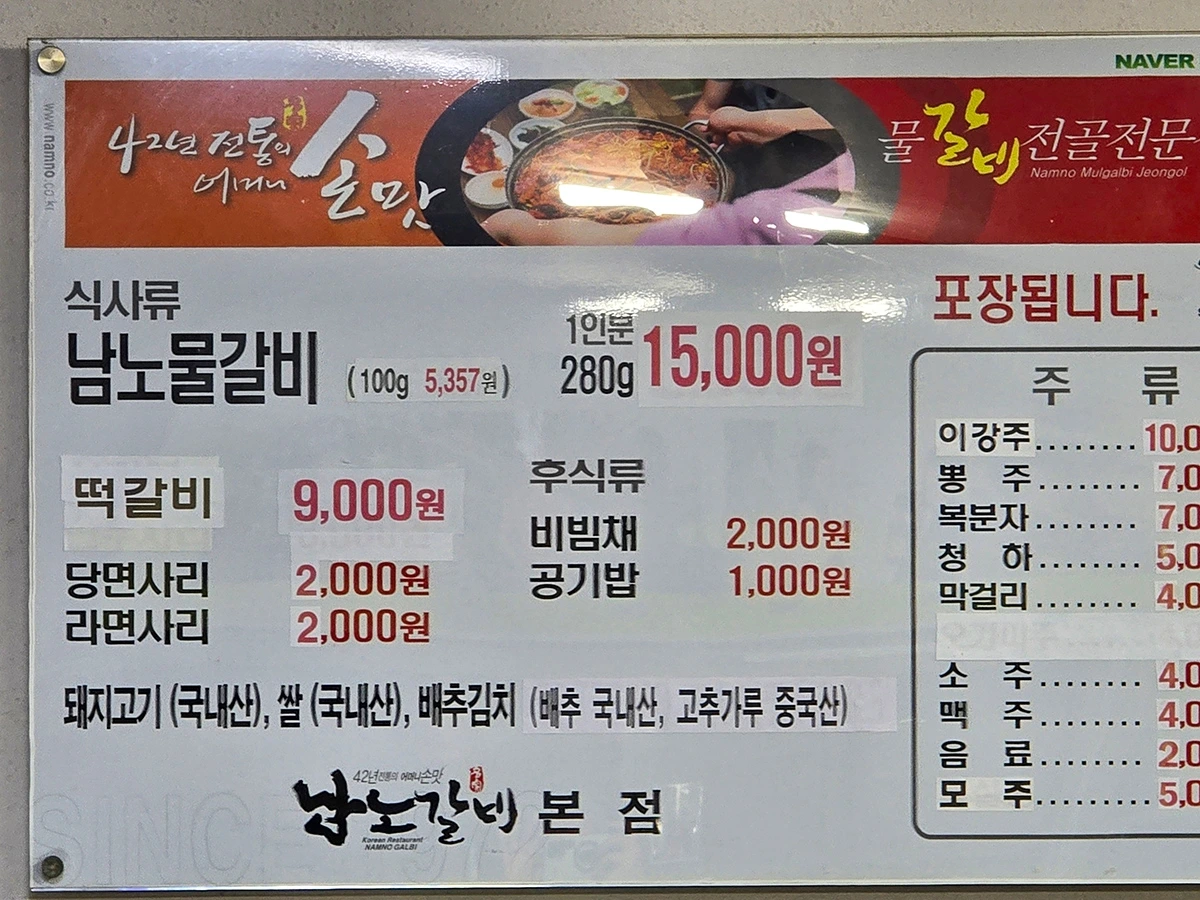 전주한옥마을 하면 생각나는 대표적인 노포 맛집 중 하나인 남노갈비 본점은 전주식 물갈비라는 요리의 원조 격이라 할 수 있는 물갈비 전문점이다. 1972년부터 최근까지 50년 넘는 긴 세월을 오직 하나 단일메뉴 물갈비만 팔아온 고집이랄까 자긍심 넘쳐나는 맛집이기도 하다. 바꿔 말하면 그거 하나만 팔면서도 50년 넘게 손님들이 줄을 이을 정도여서 굳이 다른 메뉴를 고민할 이유가 없는 성공한 맛집이란 얘기도 되시겠다.