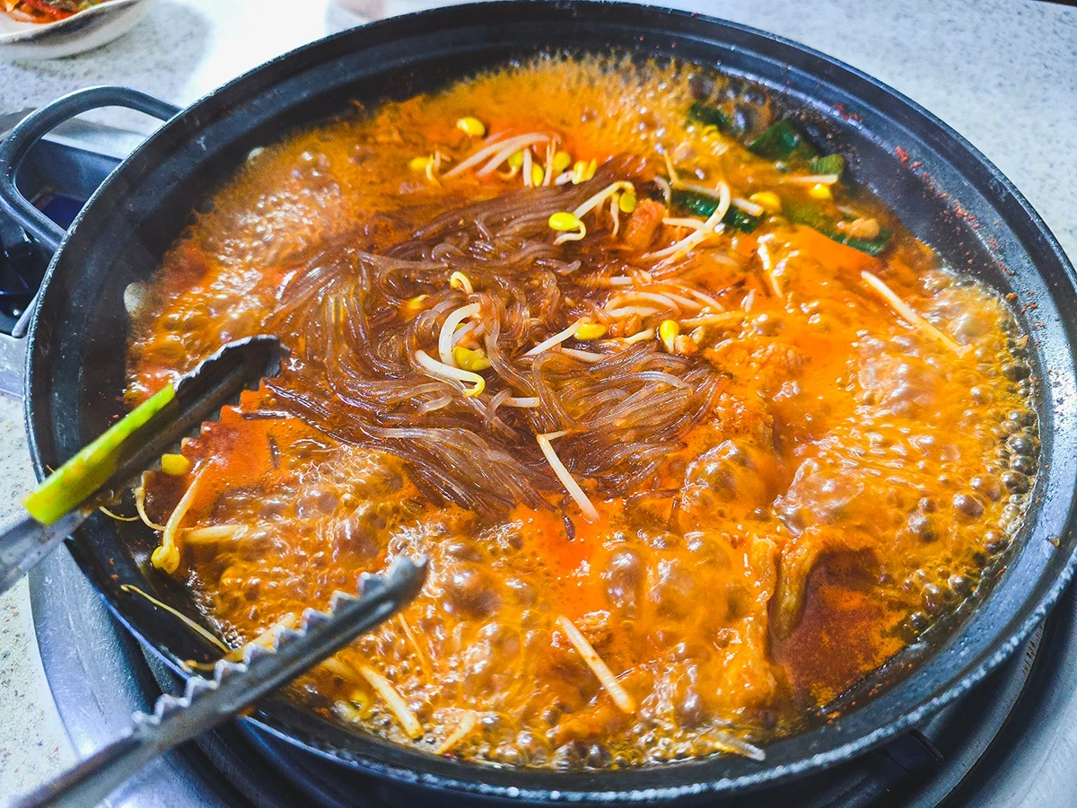 그래봐야 사실 뼈 무게를 빼고 나면 실질적인 고기 그램수는 얼마 되지 않아서 먹성 좀 있는 손님들의 경우 간에 기별도 안 가기 십상인데, 그런 손님들을 위해 남노갈비 본점은 당면사리와 콩나물을 푸짐하게 얹어주는 건 기본이요, 추가로 라면사리와 당면사리를 넣을 수 있도록 옵션을 집어넣고, 그래도 부족하면 비빔채라는 이 집 또 하나의 시그니처메뉴 후식 신공으로 배고픈 손님들 배때기를 사정없이 후려갈기고 있다.