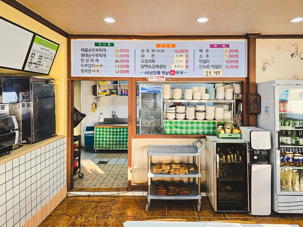 그렇게 3전4기인지 4전5기인지 모를 끈질긴 시도 끝에 가까스로 테이블 하나를 차지하는데 성공한 엄마의손두부에서 이날 우리가 주문한 메뉴는 청국장백반과 생두부 한 모. 평소 청국장이라면 사족을 못 쓰던 아내가 이날 따라 김치찌개가 땡긴다고 하는 바람에 원래는 김치찌개 하나 청국장백반 하나를 주문하려 했었으나, 2인분 이상만 주문 가능하다는 사장님 설명에 따라 어쩔 수 없이 이 집 시그니처메뉴라는 청국장백반을 먹어보는 걸로 의견을 모은 결과다.