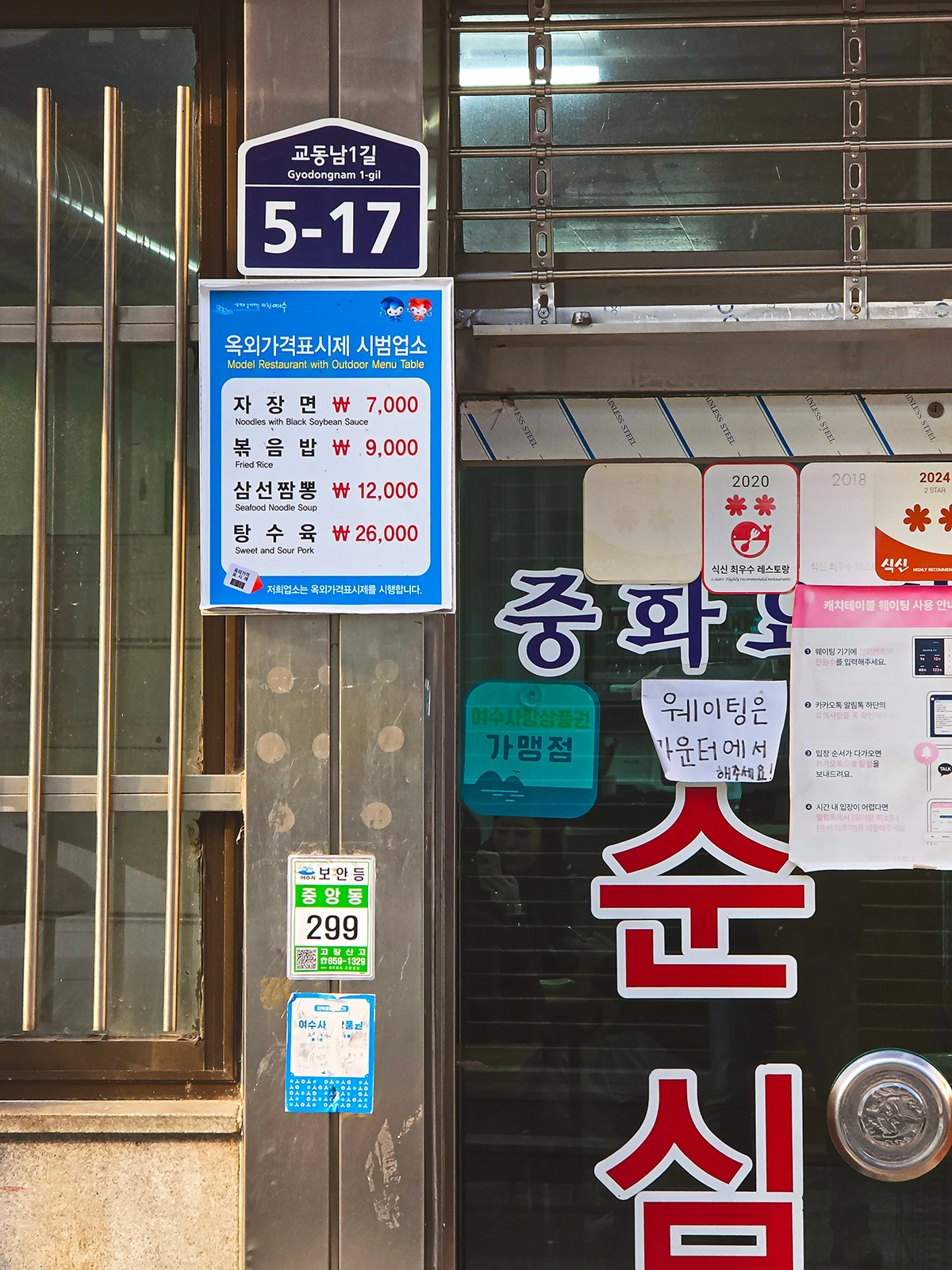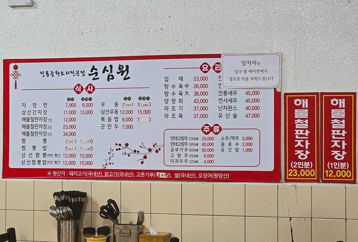 두 번째로 이 집에서 눈길을 끌었던 건 혼밥이 가능한 운영시스템을 갖고 있었다는 거다. 맛집이라고 이름 좀 난 음식점들 대부분이 기본주문 2인분 이상에 1인 1메뉴 필수를 무슨 바이블처럼 외쳐대는 게 요즘 풍토인데, 여수 순심원은 '해물철판짜장 1인분 12,000원, 2인분 23,000원'이라며 '혼밥 손님은 죄송하지만 천원 더 내셔야 한다'고, 대신에 혼자 와도 당당하게 식사하고 가시라고 벽 잘 보이는 곳에 떡하니 붙여놓았다.