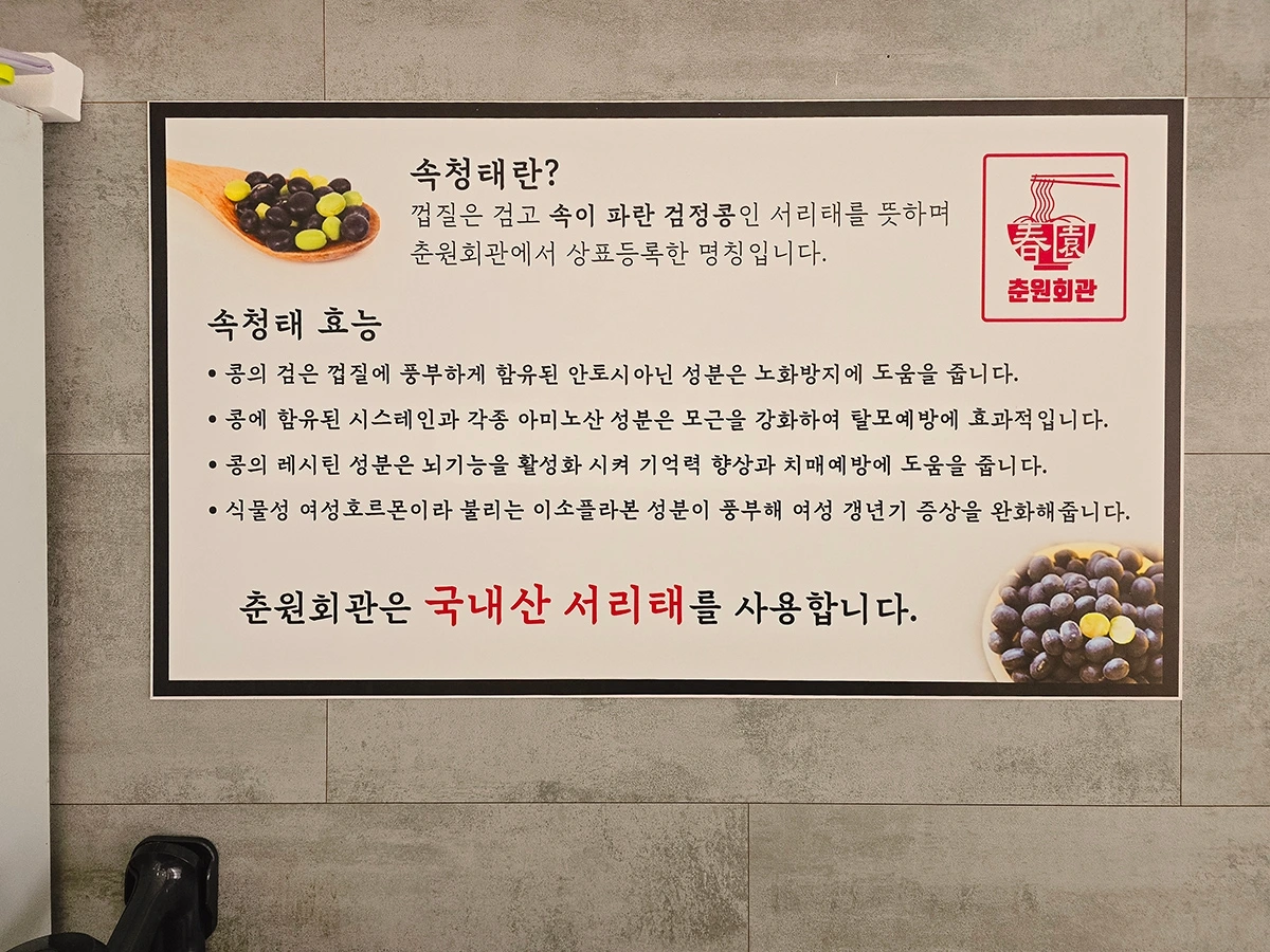 춘원회관 측 설명에 따르면 속청태라 명명한 이 국내산 서리태 콩은 ▲검은 껍질에 풍부하게 함유된 안토시아닌 성분을 통해 노화방지에 도움을 주고, ▲시스테인과 각종 아미노산 성분을 통해 모근을 강화해 줌으로써 탈모 예방에 효과적이며, ▲레시틴 성분은 뇌기능을 활성화시켜 기억력 향상과 치매 예방에 도움을 주고, ▲식물성 여성호르몬이라 불리는 이소플라본 성분 역시 풍부해 여성 갱년기 증상 완화에도 효과가 있다고 한다. 해당 증상이 있는 분들은 물론 건강에 관심있는 분들은 남원 방문 시 반드시, 기필코 "이 콩국수 한 그릇 잡숴봣!"이란 얘기 아닌가 싶다.