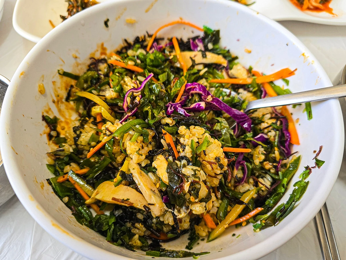 자연 그 맛도 우리가 흔히 먹어온 육지식 비빔밥과는 많이 달랐는데, 좀 과장되고 뭔가 있는 척 하길 좋아하는 먹방 방송국놈들 같았으면 "바다가 한 입 크게 목구멍 속으로 밀려드는 느낌"이라거나 "이 한 그릇 안에 바다가 담겨있는 것같다" 따위 오버스런 표현을 썼을지도 모르겠지만 내 느낌은 그저 '오독오독 씹히는 맛이 재밌는데 더해 해초와 전복에 묻은 바닷맛이 살포시 더해지는' 정도.