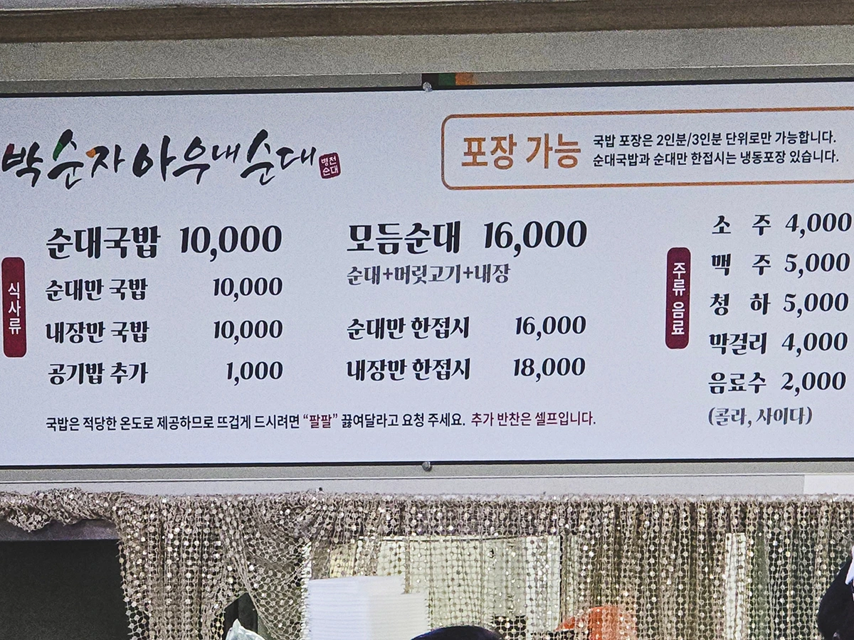 한 가지 주의할 건 바로 옆 아우내장터(이름이 낯익다 싶은 분들이 많을 건데 유관순 열사께서 만세운동을 전개했던 그 아우내장터 맞다) 오일장 장날인 끝자리 1, 6일과 주말 혹은 공휴일이 겹치는 날은 피해서 방문하는 게 좋다는 거다. 내 경우 어찌어찌하다 보니 오일장 장날과 주말이 겹친 날짜에 이곳을 방문하게 됐는데, 차 한 대 주차할 곳 찾기 힘들 만큼 정말 온 동네가 차량 정체와 주차난으로 난리법석이 벌어졌고, 박순자아우내순대는 물론 다른 이름난 순대국밥 맛집들도 웨이팅 행렬이 길게 늘어서 밥 한 그릇 사먹기 아주 매우 많이 힘든 상황이 벌어졌었다.