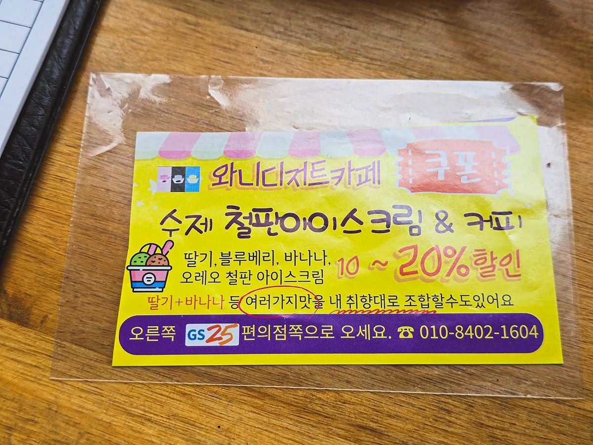이 대목에서 또또 한 가지 더 재밌는 건 이곳 군산 지린성에서 땀을 뻘뻘 흘리며 고추짜장을 맛나게 먹다 보면 어느 순간 웬 그림자 하나가 슬며시 다가와서는 내 테이블 위에 명함 크기 광고지 하나를 놓고 간다는 거다. 그 내용인즉 인근에서 아이스크림을 파는 집 광고를 담은 건데, 고추짜장 먹느라 매워 죽겠는 속을 달콤한 아이스크림으로 달래주라고 유혹하는 거다. 그 너무나도 자연스럽고 당당한 태도로 미루어 보건대 아마 같은 동네 가게들끼리 서로 상생하자는 차원에서 지린성 사장님이 묵인내지 협력하는 관계로 추정되는데, 대박난 가게와 그 이웃 가게가 서로 돕고 사는 듯한 이 모습에서 따뜻한 인간미가 느껴져 좋았다.