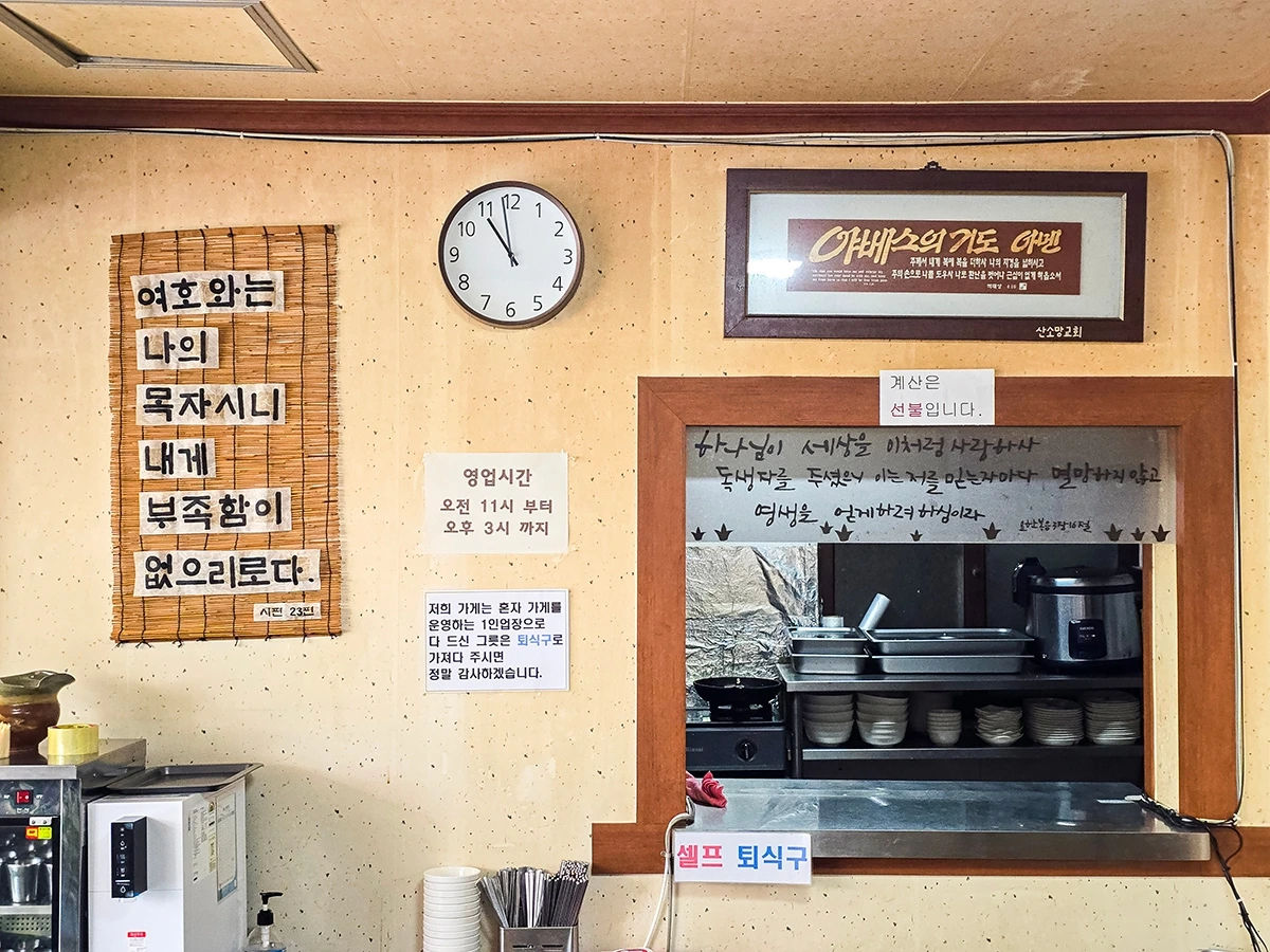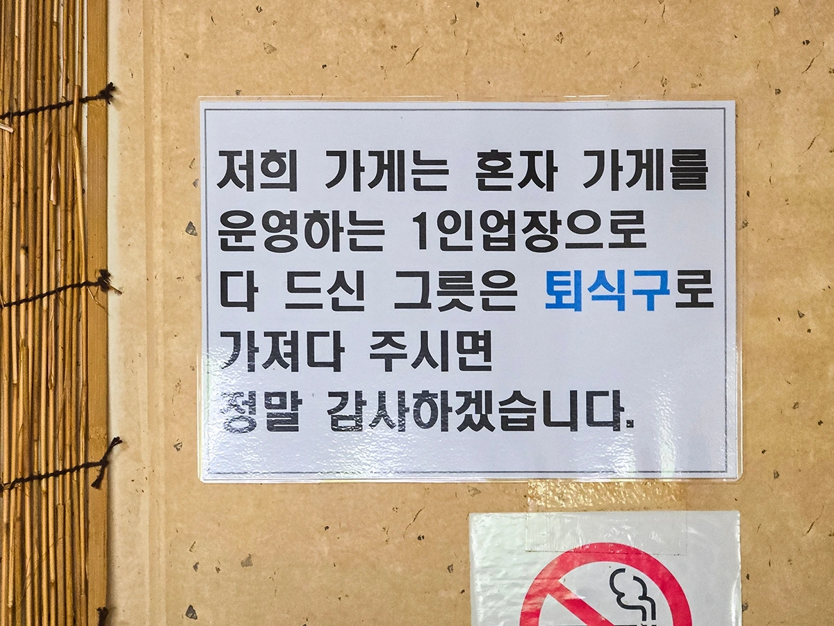 주문한 음식이 나올 때, 음식을 다 먹고 났을 때 직접 주방 창구에서 음식을 받아오거나 식판을 반납하는 것도 이곳의 국룰이다. 단골 손님들의 경우 너무나 당연하다는 듯 알아서 행동하곤 하는데, 처음 간 손님은 살짝 당황할 수도 있으니 국룰 정도는 숙지하고 방문하는 걸 추천한다.