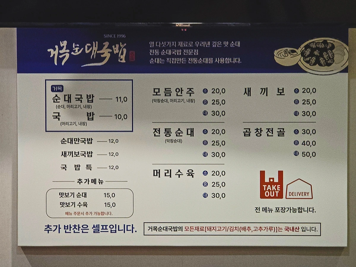 거목순대국밥 시그니처 메뉴는 두 말 하면 입 아픈 순대국밥이다. 비법의 재료와 30년 노하우를 아낌없이 때려넣어 뽀얗게 잘 끓여낸 잡내 하나 없는 깊은 국물맛을 바탕으로 막창 껍질을 이용해 만든 순대맛이 일품이라고 평가받고 있다.