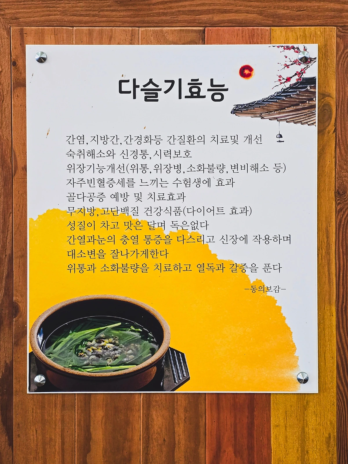 여러 다슬기 요리들 중 손님들에게 가장 인기를 끄는 건 단연 다슬기탕과 다슬기수제비다. 숙취 해소와 각종 간질환 치료 개선에 효과가 있다는 식재료가 다슬기이다 보니 전날 술 한 잔 거하게 걸친 뒤 해장을 위해 찾는 손님들이 많은데, 탕이 됐건 수제비가 됐건 자극적이지 않으면서도 깊은 맛이 우러나는 다슬기 국물을 한 그릇 들이키고 나면 해장은 물론 속이 다 시원해지는 느낌이 든다는 건 안 비밀이다.