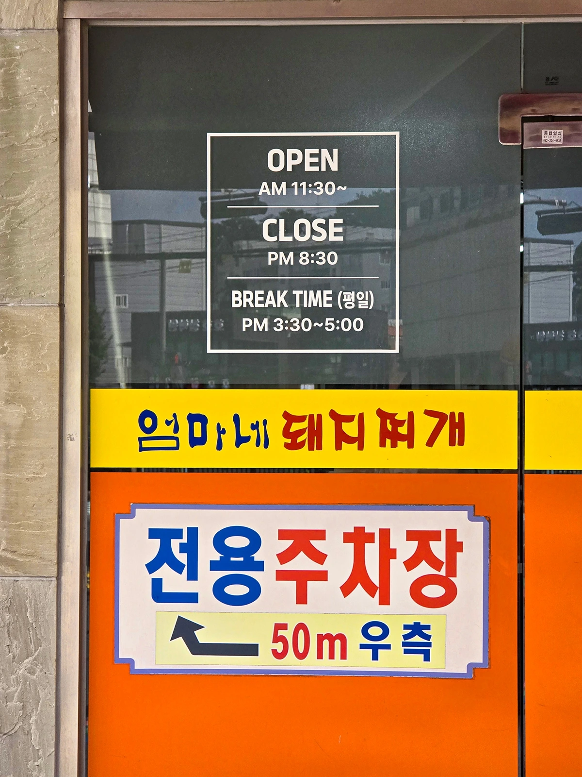 광주광역시 동구 맛집 엄마네돼지찌개는 매일 오전 11시30분부터 저녁 8시30분까지 문을 연다. 오후 3시30분부터 5시까지는 브레이크타임(평일 기준)이며, 매주 일요일은 정기휴무다. 주차장은 가게 왼쪽 벽을 따라 50미터 정도 가면 5~6대 정도 주차 가능한 공간이 나오며, 주차공간이 부족할 경우 바로 옆에 유료주차장이 있으니 이곳을 이용하면 된다.