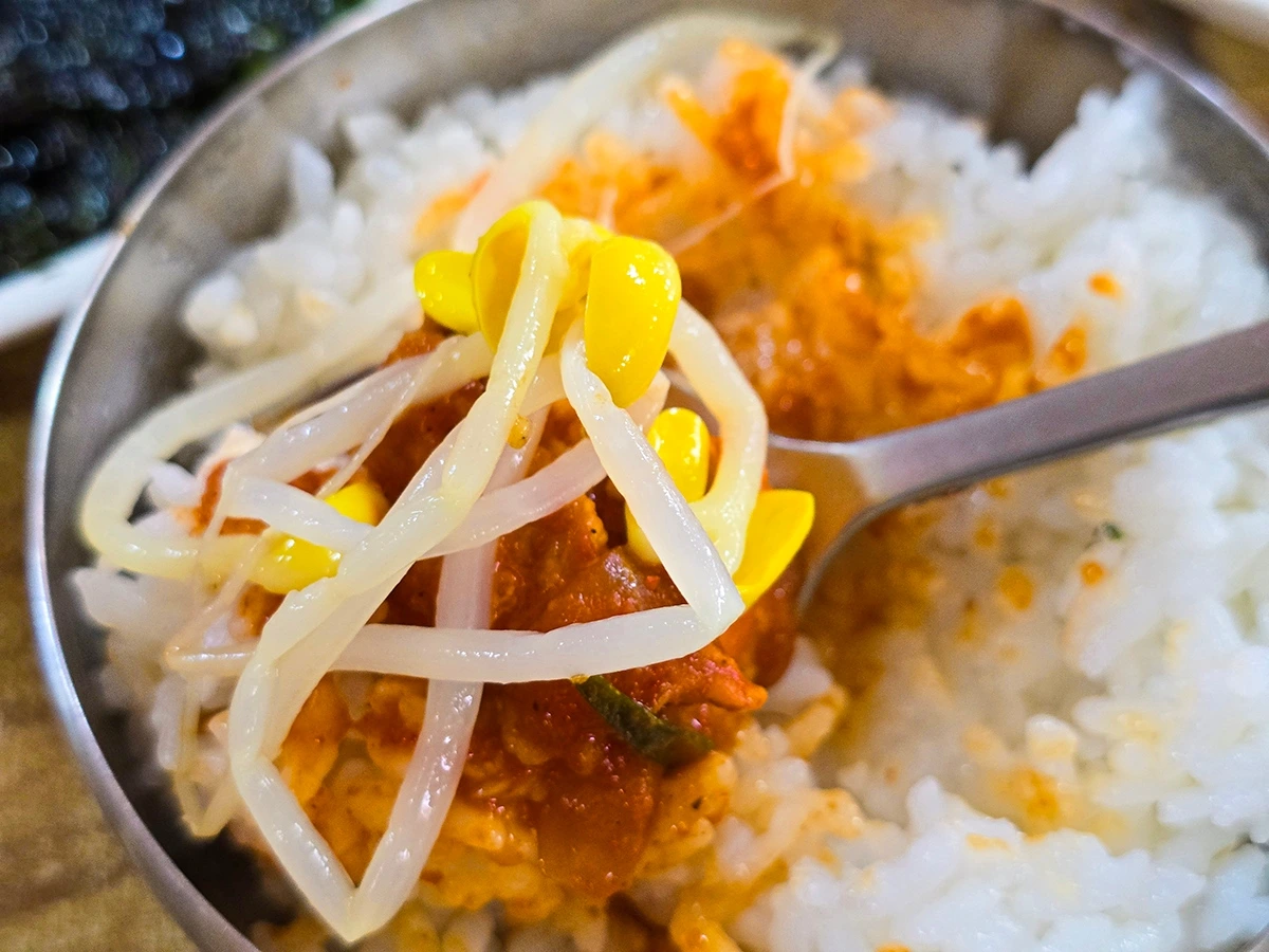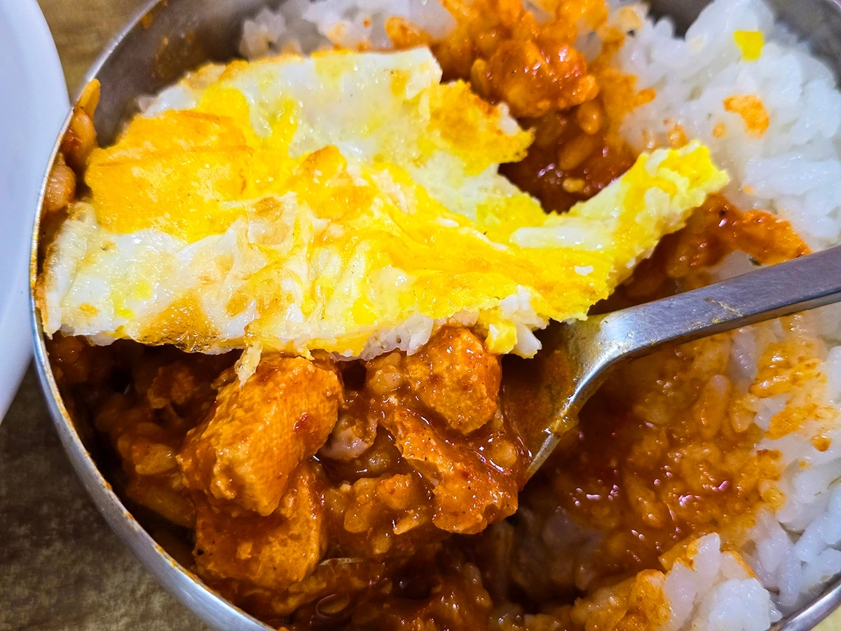 한 가지 특기할만한 사실은 메뉴명은 찌개지만 실제 먹어보면 엄마네돼지찌개는 짜글이 느낌에 더 가깝다는 거다. 그 차이를 쉽게 설명하자면 찌개류는 국물이 흥건해서 밥을 말아먹기 적합한 반면, 짜글이류는 국물이 걸쭉하고 되직해서 밥을 비벼먹기에 적합하다고나 할까. 찌개 국물을 농축하고 또 농축해서 더더더더 강렬한 매운맛 농축액 찌개를 만든 느낌이라고 해도 좋을 듯하다.
