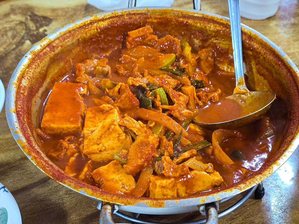 한 가지 아쉬웠던 건 돼지 앞다리살을 주로 사용한 걸로 보이는 찌개 내용물이 기대에 좀 못 미쳤다는 사실이다. 메뉴 이름이 돼지찌개였던 만큼 고기가 주연 자리를 꿰차고 나머지 두부 등 재료들이 조연을 맡았을 거라 기대했던 것과는 달리, 두부가 주연처럼 보였기 때문이다.
