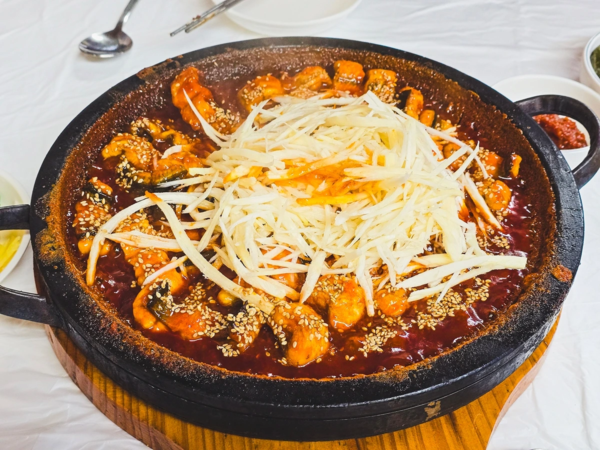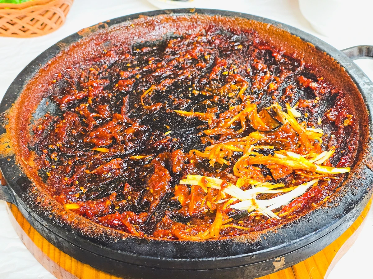 남원 한정식 맛집 삼포가든의 시그니처 메뉴는 고추장더덕장어구이. 일반적으로 장어 하면 생각나는 소금구이나 양념구이 방식이 아닌 고추장 소스가 듬뿍 들어간 돌판 위에 굽는듯 볶는듯 구운 다음 생더덕을 피자에 치즈 토핑하듯 산더미처럼 쌓아올려 나오는데, 일단 그 비주얼부터 군침을 한웅큼 흘리게 만들 만큼 아주 매우 많이 매혹적이었다.