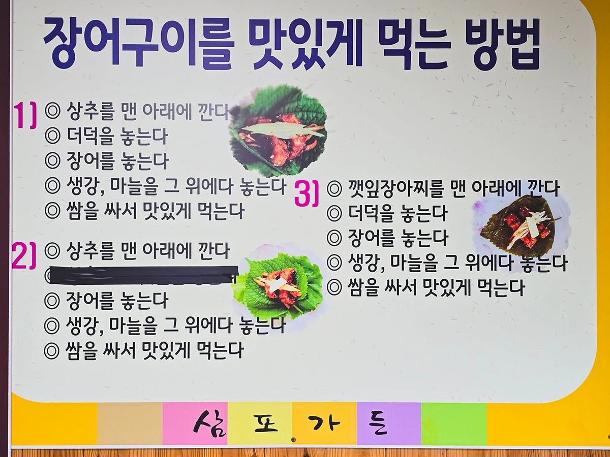 음식점 중간중간 벽에 큼지막하게 바로 그 맛있게 먹는 방법을 센스있게 붙여놓으셨는데, 그에 따르면 1단계는 상추를 밑에 깐 뒤 더덕과 장어, 생강, 마늘을 함께 싸서 먹는 방법이고, 2단계는 더덕만 뺀 채 같은 방법으로 쌈을 싸 먹는 방법, 3단계는 상추 대신 깻잎장아찌를 밑에 깐 뒤 더덕과 장어, 생강, 마늘을 올려 먹는 방법이다.