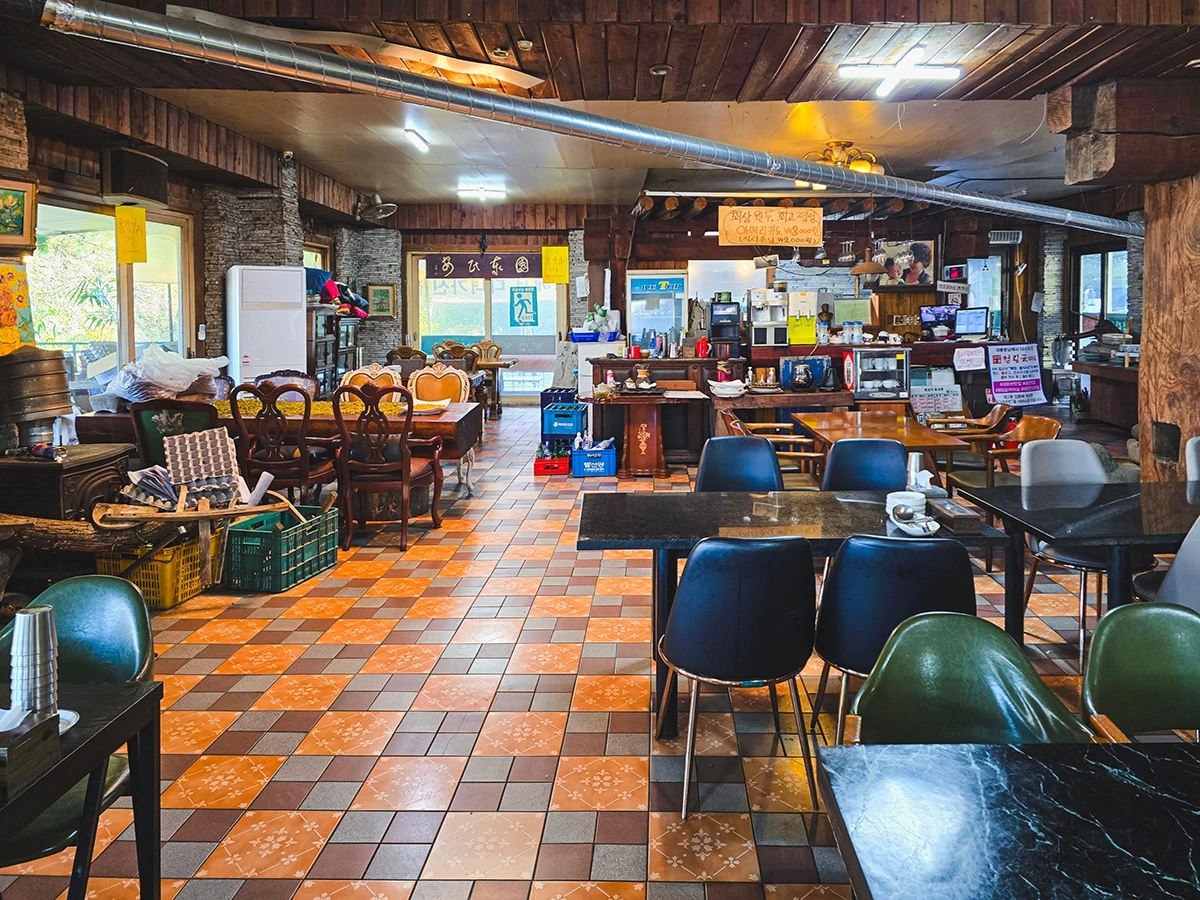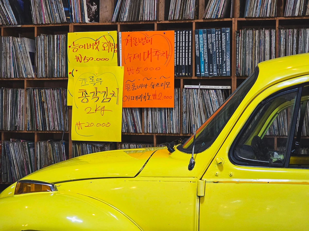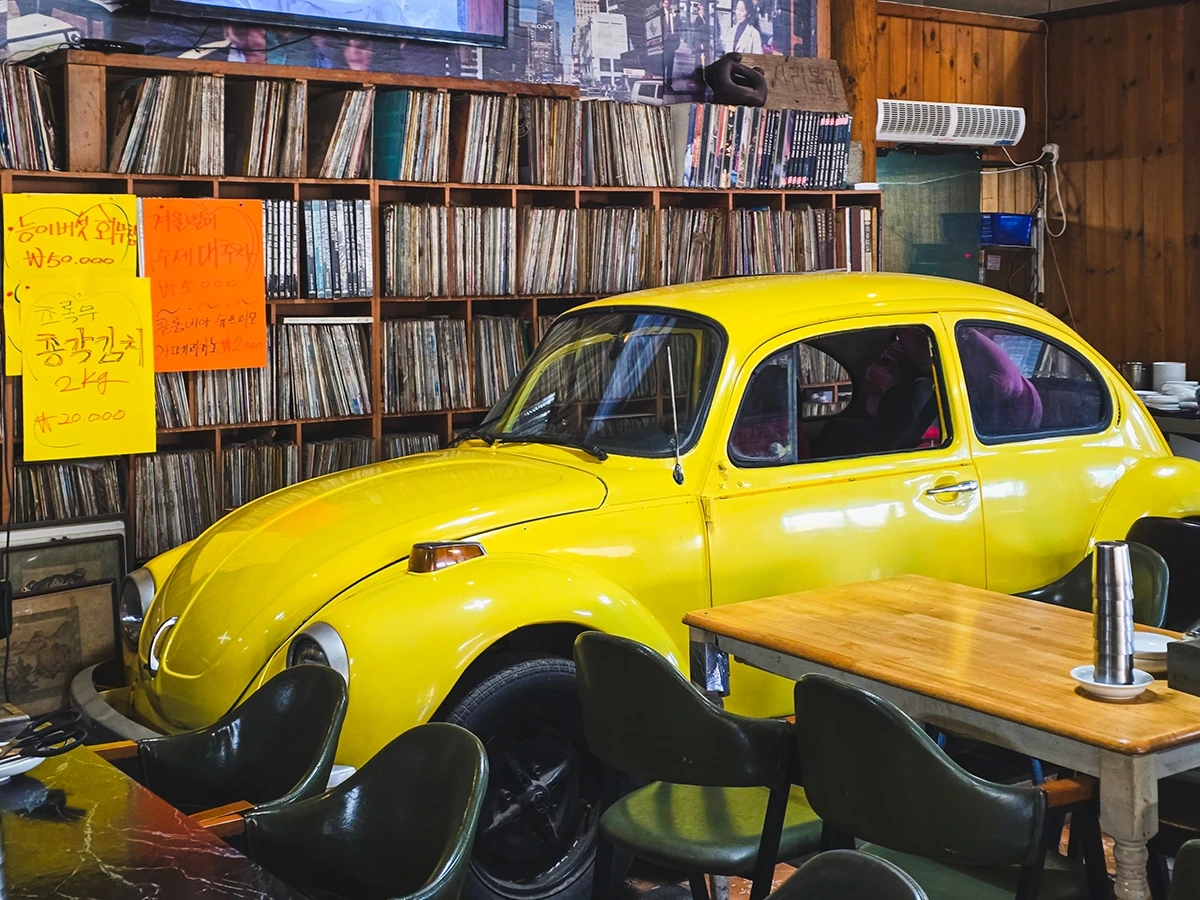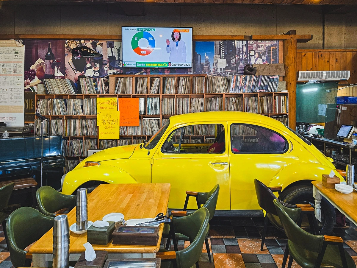 특히 한쪽 벽면을 가득 채운 수천 장쯤 돼보이는 오래된 LP판들을 배경으로 노란색 폭스바겐 한 대가 턱하니 서있는 모습이 시선을 강탈하고, 다른쪽 벽면엔 통나무가 타닥타닥 소리를 내며 타오르는 벽난로가 '갬성'을 자극하는 등 아기자기한 볼거리들이 실내 곳곳에 포진해 있어 눈을 즐겁게 해주고 있다.