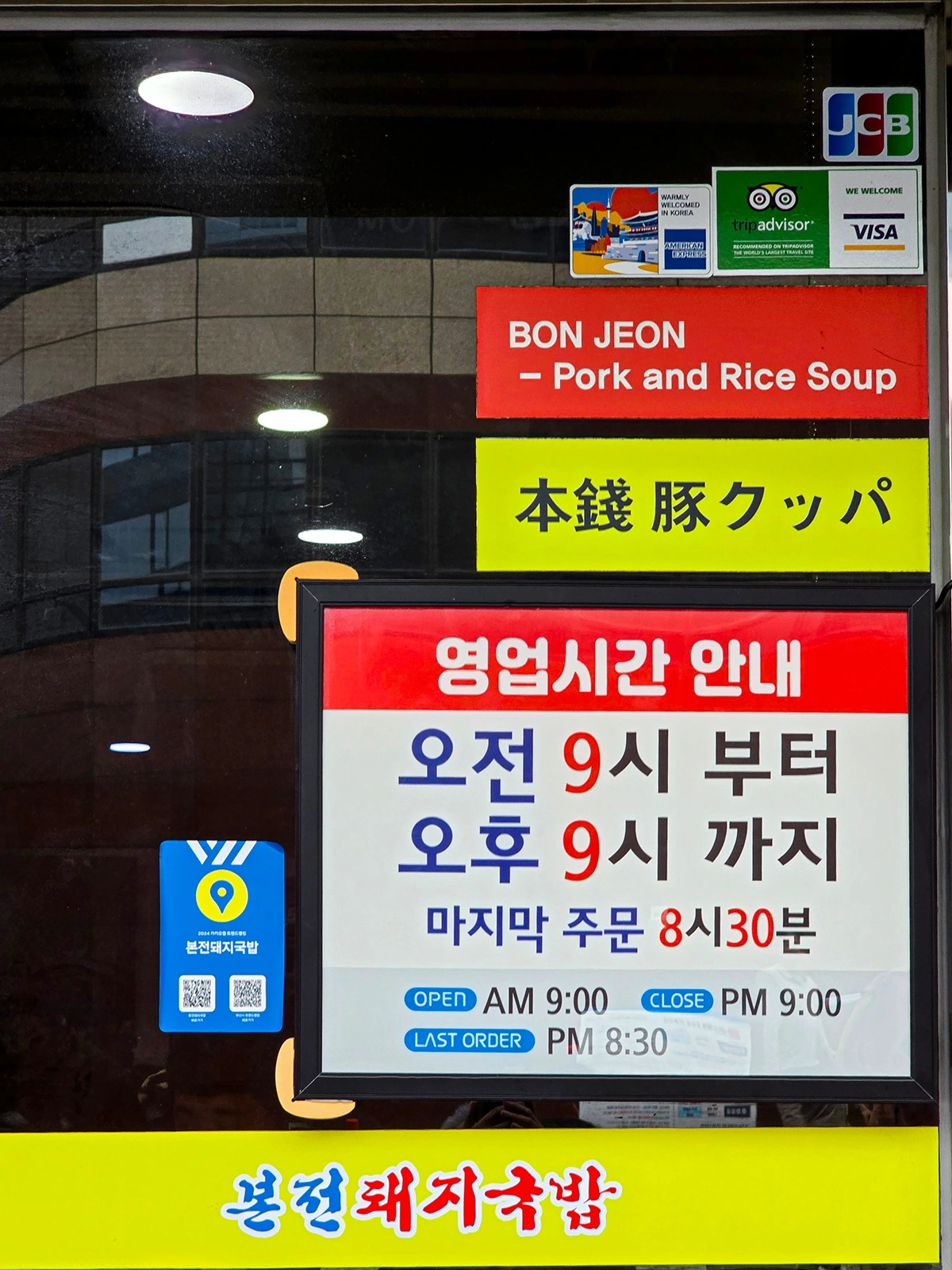 부산역을 오가는 여행객들이 줄서서 찾는 맛집 본전돼지국밥은 매일 오전 9시부터 오후 9시까지 문을 연다. 휴무일 표시가 따로 없는 걸로 미루어 정기휴일은 없는 걸로 보이며, 브레이크타임 또한 없는 걸로 판단된다.