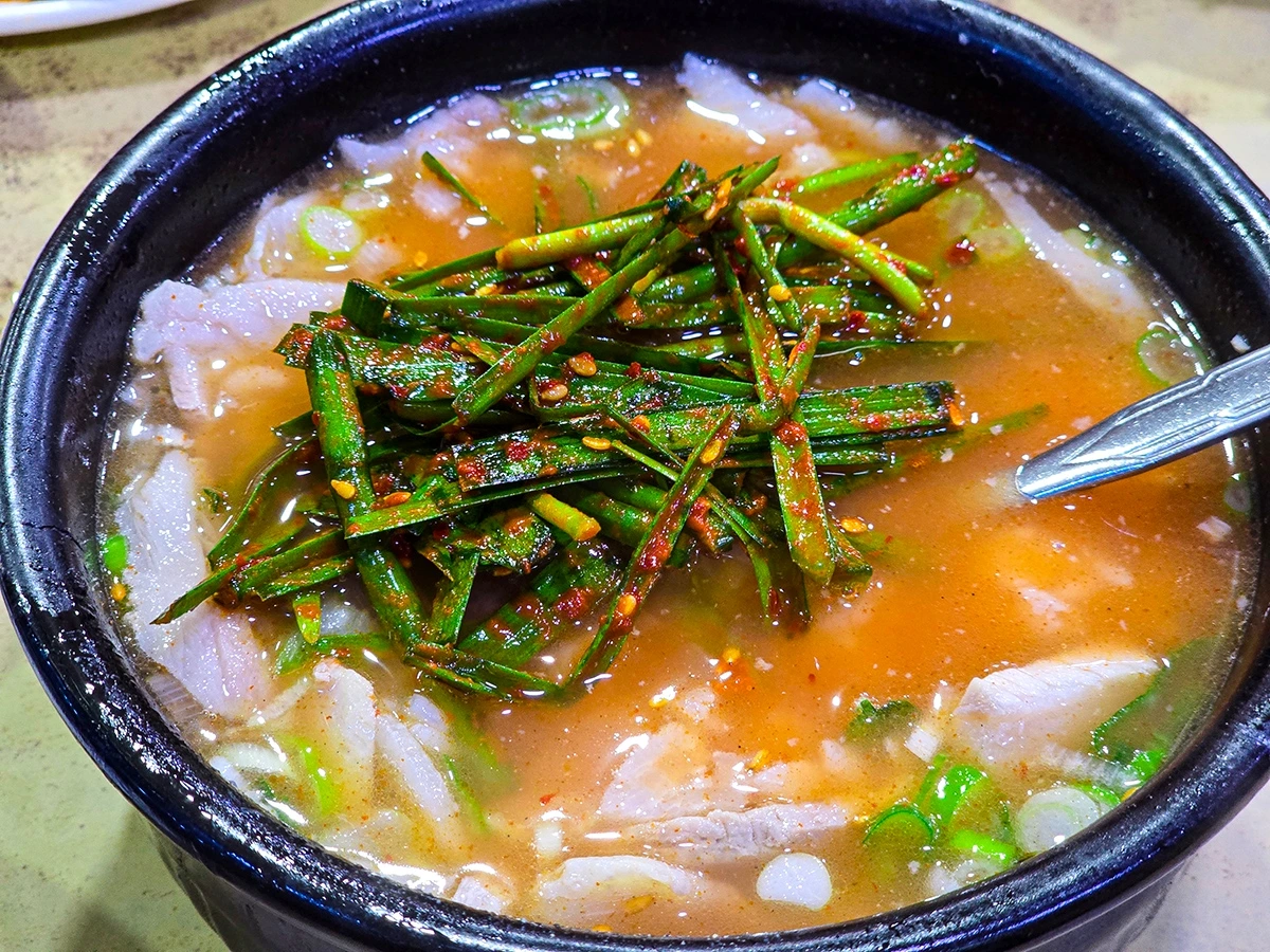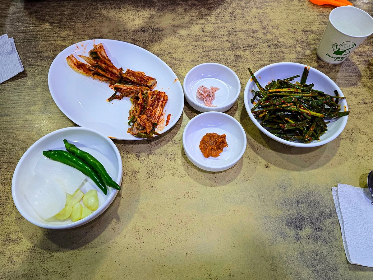덕분에 자칫 잘못 조리하면 돼지냄새 류의 잡내가 나기 쉬운 돼지국밥 국물이 깊고 진한 풍미 속에 구수함까지 곁들여져 입안을 즐겁게 해줬는데, 함께 나온 부추무침(부산 사투리로는 정구지라고 한다던가)과 새우젓, 직접 담은 듯한 김치와 곁들여 먹으니 더더더더 맛있었다. 아재개그 식으로 표현하자면 '본전' 생각이 전혀 나지 않을 만큼 존맛이었다고나 할까.