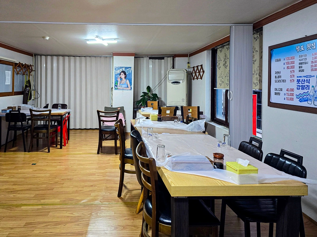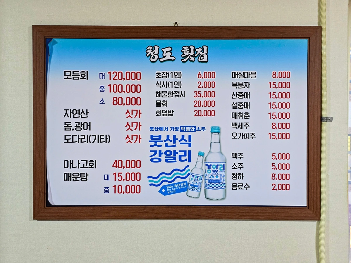 부산 광안리 민락해변공원 근처 민락회타운 구역에 자리잡고 있는 55년 노포맛집 청도횟집은 매일 오전 8시30분부터 밤 12시까지 문을 연다. 휴무일 표시가 따로 없는 걸로 봐서 정기휴무일은 없는 걸로 보이는데, 정확한 건 방문 전 예약겸 전화문의를 하는 걸 추천한다.