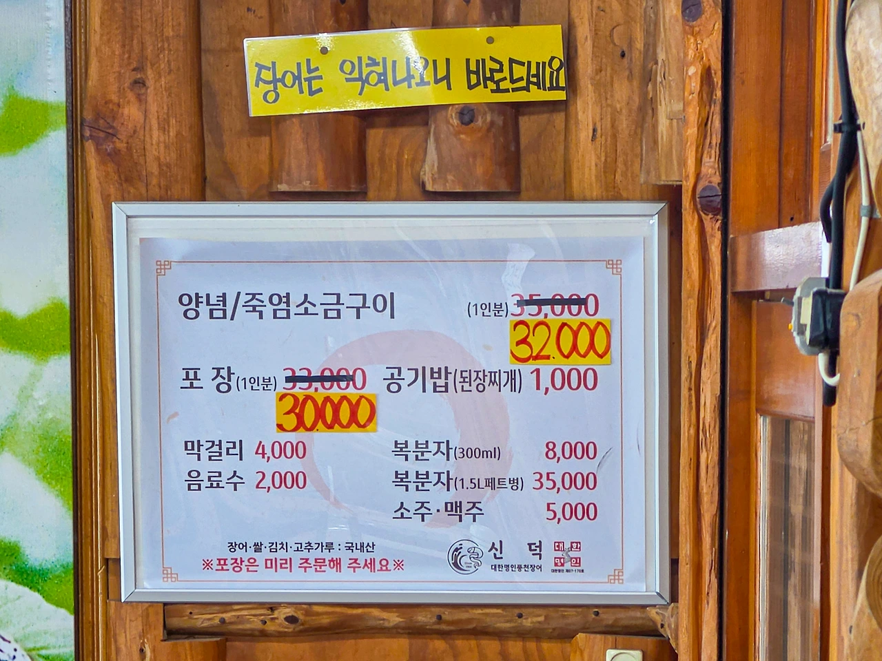 고창 신덕식당 시그니처 메뉴는 단연 풍천장어 소금구이와 양념구이 두 가지. 나머지 메뉴라고 해봐야 1인분에 1,000원인 된장찌개를 곁들인 공기밥과 음료들 밖에 없을 정도로 풍천장어 하나에 아주 매우 많이 진심인 음식점이다.