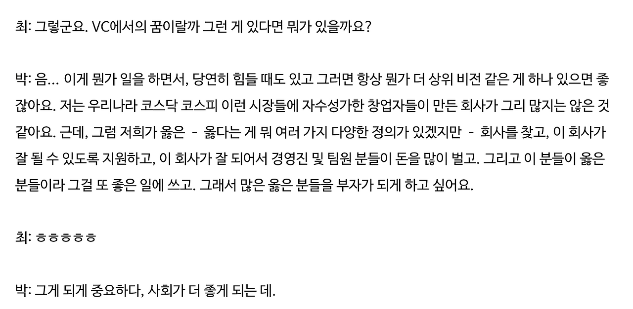 VC 들어온 지 얼마 되지 않았을 때에 '일하면서 현타가 올 때가 있을텐데, 그 때 나를 붙잡아줄 상위 비전 같은 거 하나 있으면 좋지 않을까?' 하는 생각에서, 마음에 담은 비전이 있었고 가끔 스스로 되새기면서 얼마나 왔나.. 하고 가늠해보던 것이 있다.