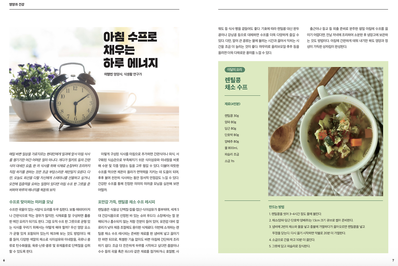 이렇게 구성된 식사를 아침으로 추가하면 간편식이나 외식, 서구화된 식습관으로 부족해지기 쉬운 식이섬유와 미네랄을 비롯해 수분 및 각종 영양소 등을 고루 챙길 수 있다. 더불어 따뜻한 수프를 먹으면 체온이 올라가 면역력을 지키는 데 도움이 되며, 후후 불며 천천히 식사하는 동안 정서적 안정감도 느낄 수 있다. 건강한 수프를 통해 진정한 의미의 미라클 모닝을 실천해 보면 어떨까.